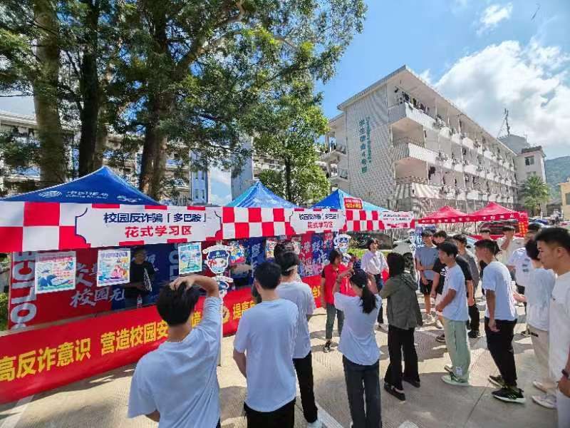 在学生宿舍11号楼前设置的国家网络安全宣传周活动点,由我校安全保卫处、现代教育数字中心的老师,以及福清网安大队的警官,向过路学生发放宣传手册,并邀请学生扫码答题,以此开展网络安全知识宣传,普及国家网络安全法律法规,热情讲解常见电信网络诈骗手法和新型AI诈骗手法,提供个人信息保护建议,提高学生反诈骗识别能力和防范能力。