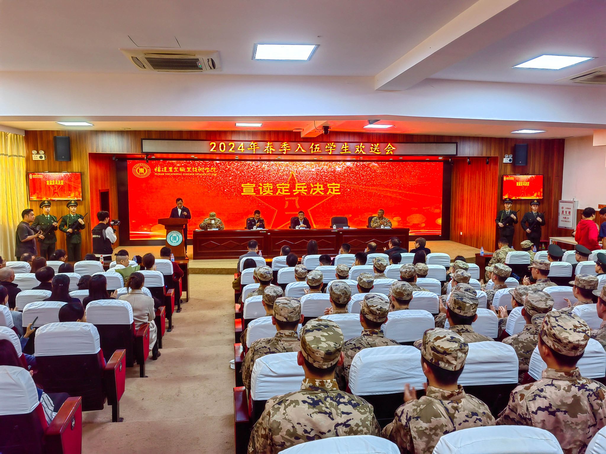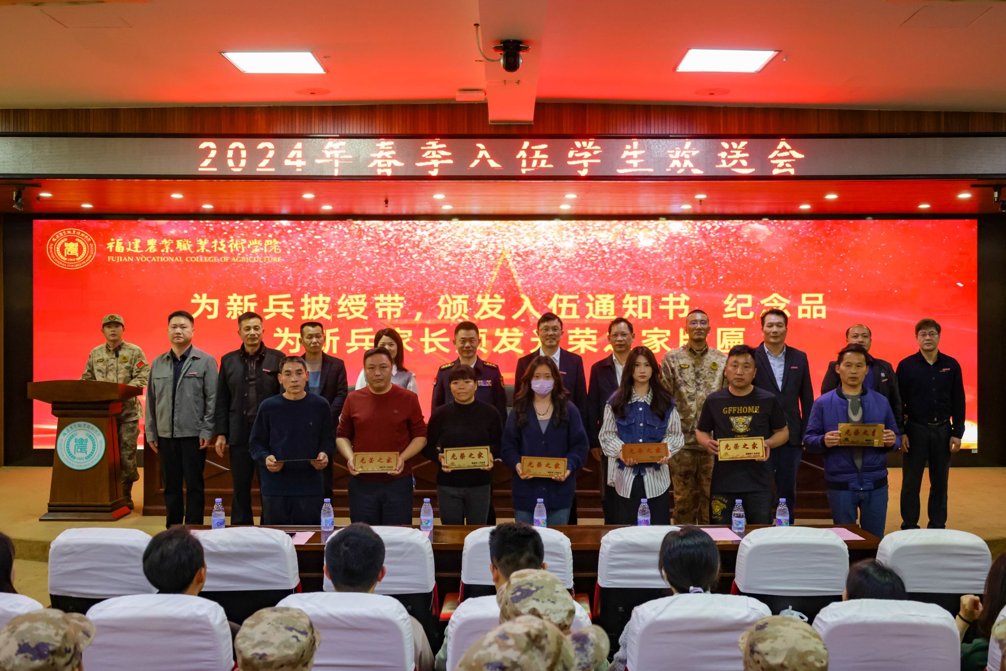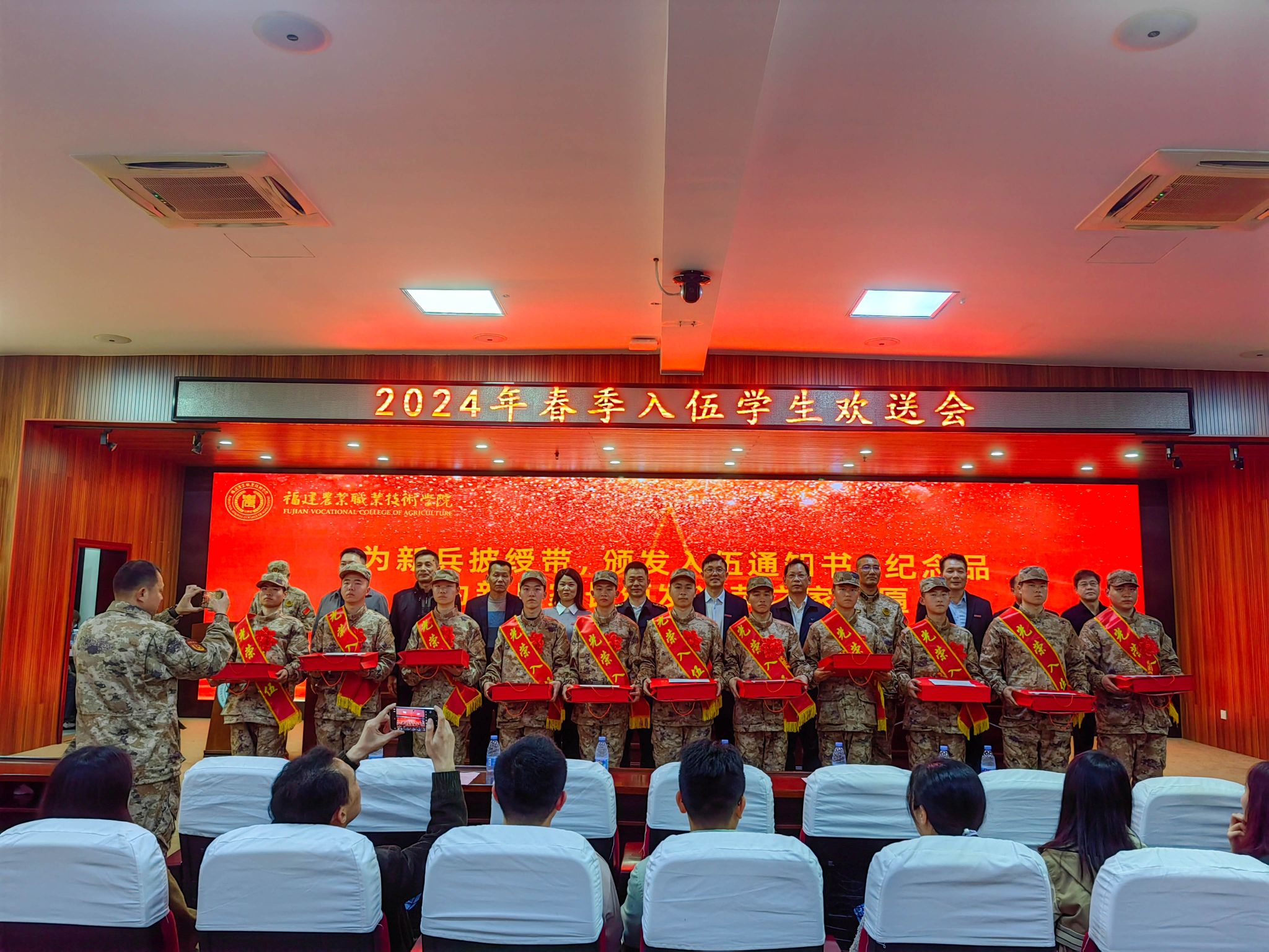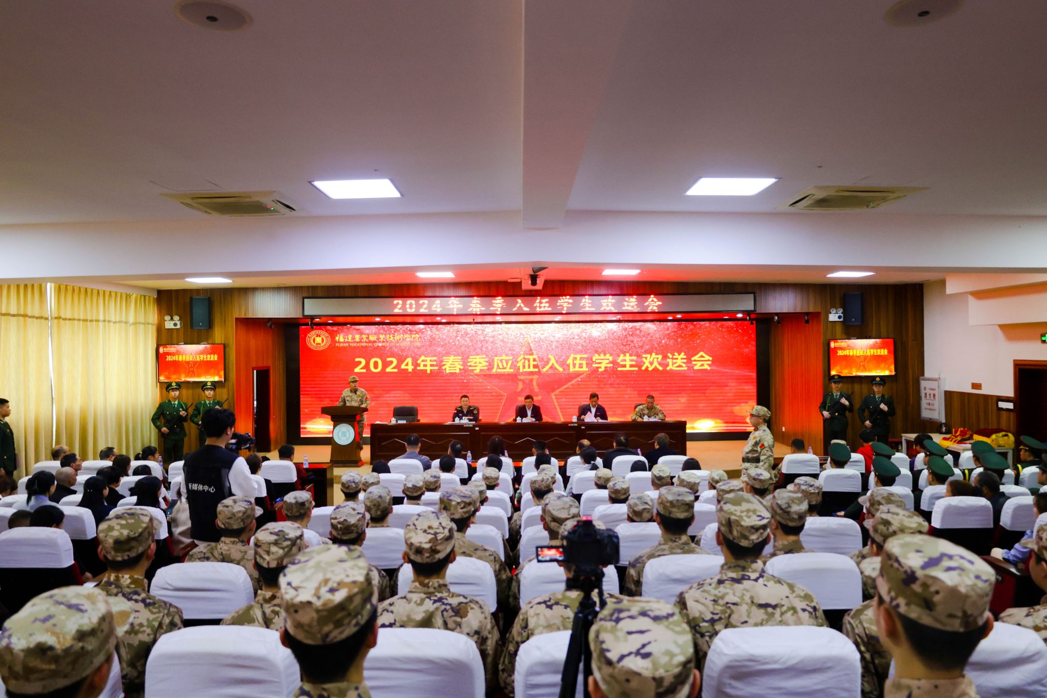 3月17日下午,我校举行2024年春季大学生入伍欢送会,欢送我校即将启程奔赴军营的50名大学生新兵。校党委副书记、校长何东进,福清市人民武装部部长方友,校党委副书记王振亮,福清市镜洋镇人民武装部部长王为平,各相关职能部门、二级学院负责人,校院两级征兵工作人员、退役复学士兵代表、学生代表和50名从学校应征入伍学生,以及152位远道而来送子从军的家长参加了欢送会。会议由学校安全保卫处处长、征兵办公室主任陈剑波主持。