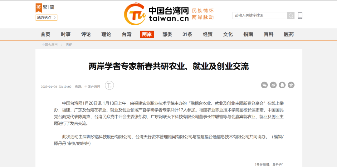 中国台湾网刊发:两岸学者专家新春共研农业、就业及创业交流