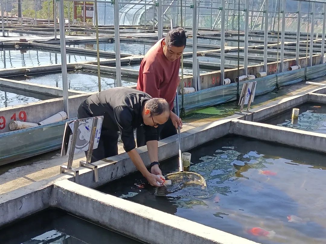 此外,科技特派员团队还积极参与金鱼育苗亲鱼筛选工作的指导。团队成员向养殖户详细介绍了亲鱼筛选的标准和方法,包括亲鱼的年龄、体型、健康状况、繁殖性能等方面的考量因素。通过现场示范和讲解,帮助养殖户掌握科学的亲鱼筛选技术,为培育优质的金鱼种苗奠定坚实基础。