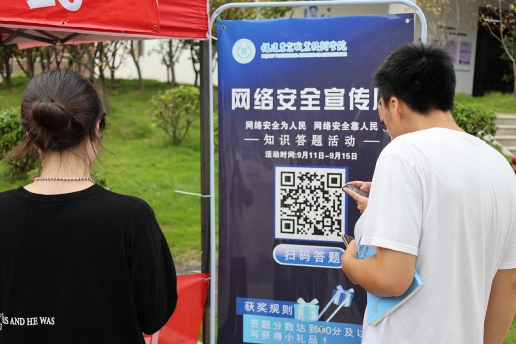 在学生宿舍11号楼前设置的国家网络安全宣传周活动点,由我校安全保卫处、现代教育数字中心的老师,以及福清网安大队的警官,向过路学生发放宣传手册,并邀请学生扫码答题,以此开展网络安全知识宣传,普及国家网络安全法律法规,热情讲解常见电信网络诈骗手法和新型AI诈骗手法,提供个人信息保护建议,提高学生反诈骗识别能力和防范能力。