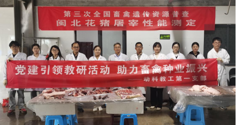 支部以党建凝心聚力充分发挥党员专家的科研优势,按照农业农村部普查测定的统一部署,压实各方责任,强化技术指导,明确任务分工,全面推进官庄花猪、槐猪、闽北花猪等福建地方猪种的屠宰性能测定各项工作。师生密切配合、通力协作,通过称重、测胴体长、取肉质样品、测PH、嫩度、滴水损失和肉样切块分样等一系列流程,顺利完成了三种猪种鉴定采样与性能测定,后续还将对福安花猪、武夷黑猪和莆田黑猪开展性能测定工作。