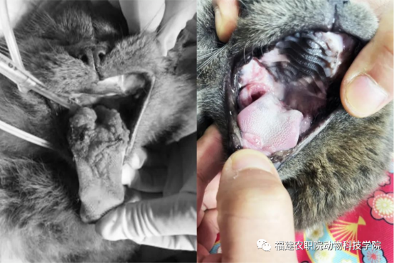 体格检查:4.24kg,精神状态、活动性较差,食欲废绝,呼吸不畅,触诊口腔疼痛反应明显,大量流涎,颚舌弓黏膜附近弥漫性炎症、溃疡,伴有卵石状增生,舌根部及咽喉处有严重的肉芽组织增生,口腔周边毛发粘附大量血液。