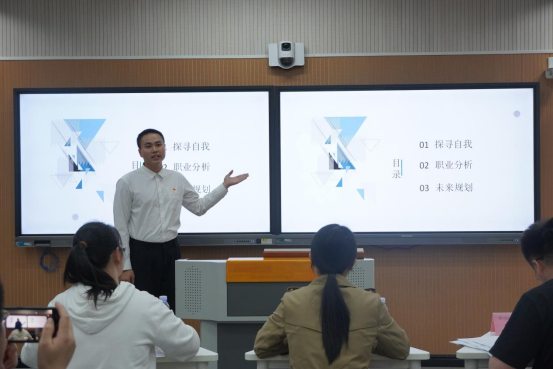 比赛分为个人演讲和现场答辩两个环节。演讲时,参赛选手要求在5分钟时间内从自我认知、环境分析、职业决策、计划路径和评估调整等几个方面进行阐述。答辩环节,各评委就选手演讲时出现的问题进行了点评,并提出合理化建议,鼓励参赛选手继续努力。