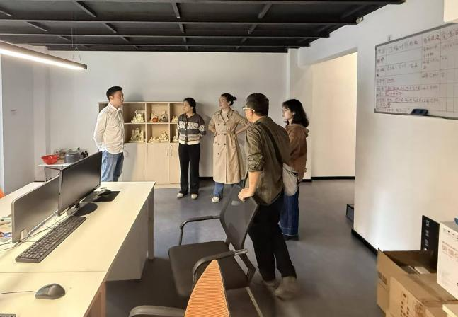 调研团队在公司设计总监郑书镯的热情接待下,依次参观了公司的展示厅、工作区等核心区域,全面了解了公司的办公环境、业务流程及企业文化。随后,双方举行了座谈会。会上,郑总监对调研团队的到访表示热烈欢迎,并详细介绍了公司的发展历程、业务范围、企业文化以及在屏南县等多地助力乡村振兴的实践案例,同时分享了公司当前的人才需求状况。