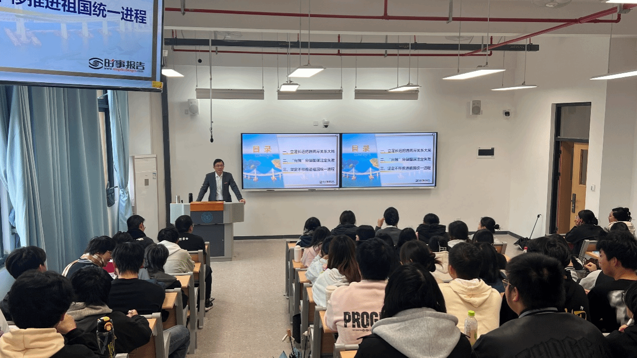 何院长首先从历史、现实与未来三个维度,对台湾问题进行了全面解读,强调了国家统一对于中华民族的深远意义。他指出,反对分裂、追求统一是中华民族的核心价值观,也是每一位青年学子的责任所在。同时,何院长还鼓励学生们将专业学习与国家发展紧密结合,以创新思维和专业技能,为推动两岸文化交流和理解贡献力量。