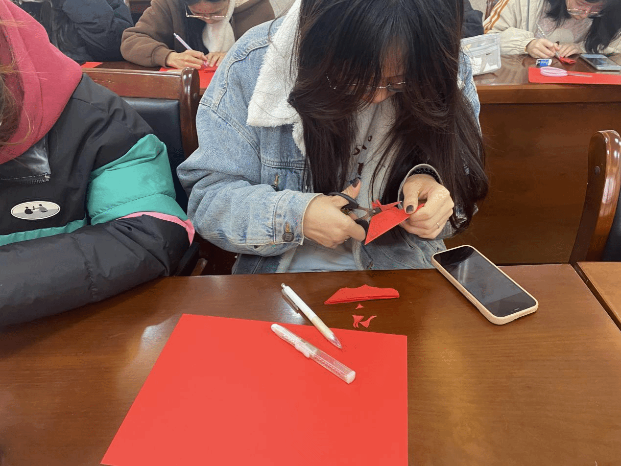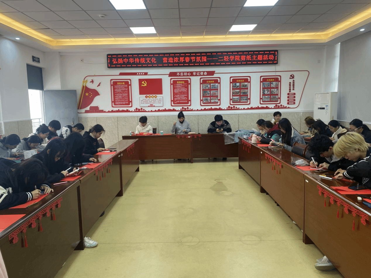为弘扬中华优秀传统文化,丰富校园文化生活,提升学生的艺术修养和动手能力,二轻学院于 2025 年 1 月 7 日在教学(2)211成功举办了“祥瑞兆丰年 艺起迎新春”剪纸活动。此次活动吸引了众多同学的积极参与,现场气氛热烈,成果丰硕。