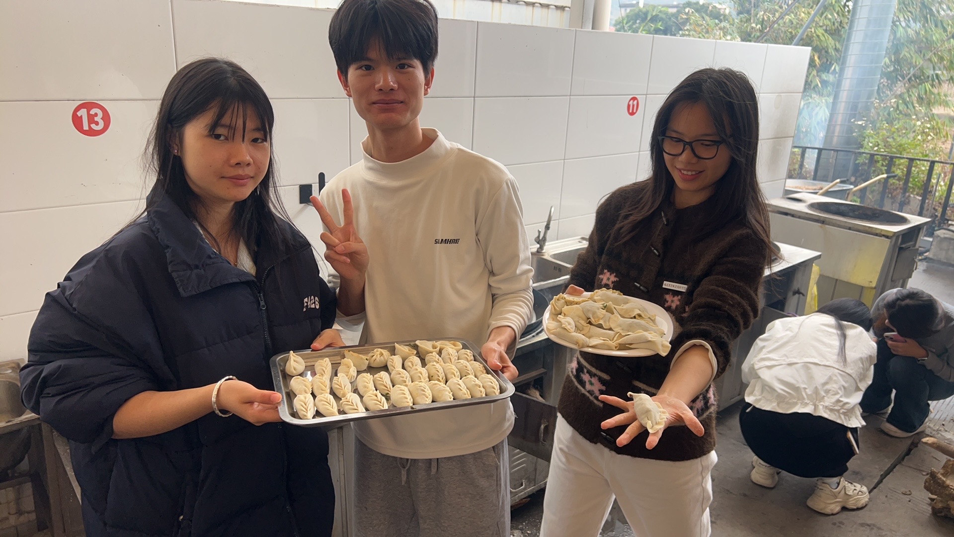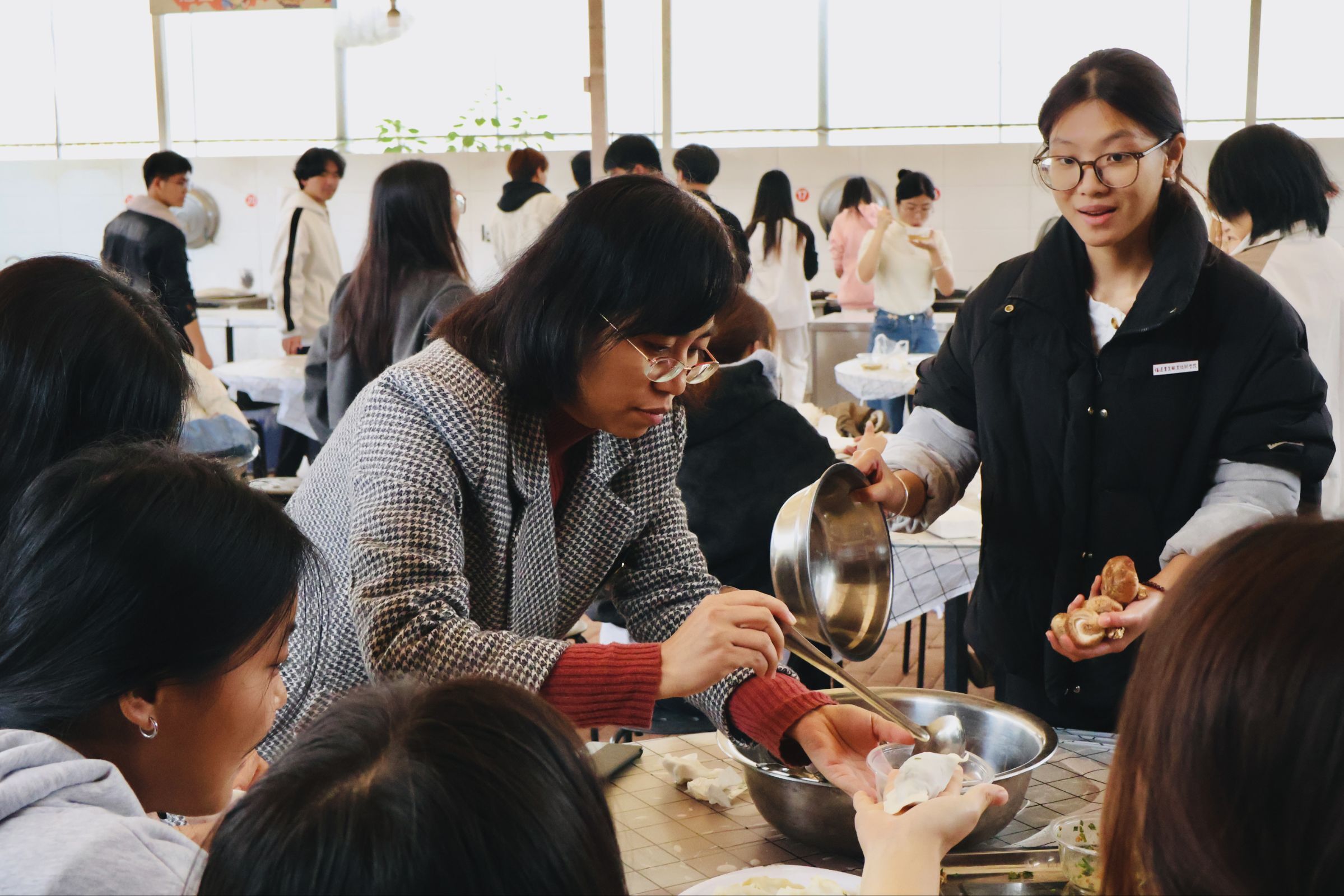 “冬至大如年,人间小团圆”包饺子环节堪称活动的暖心高潮。在包饺子区域,师生们分工协作,各显身手。和面、擀皮、填馅、捏合,一切都在有条不紊地进行着,手法娴熟的老师耐心指导着动作生疏的同学。大家一边制作美食,一边交流互动,分享着各自家乡冬至的习俗与趣事,师生情谊悄然升温。一个个形态各异、饱满可爱的饺子摆满托盘,承载着大家的创意与欢乐,为这个冬日增添了几许温暖。