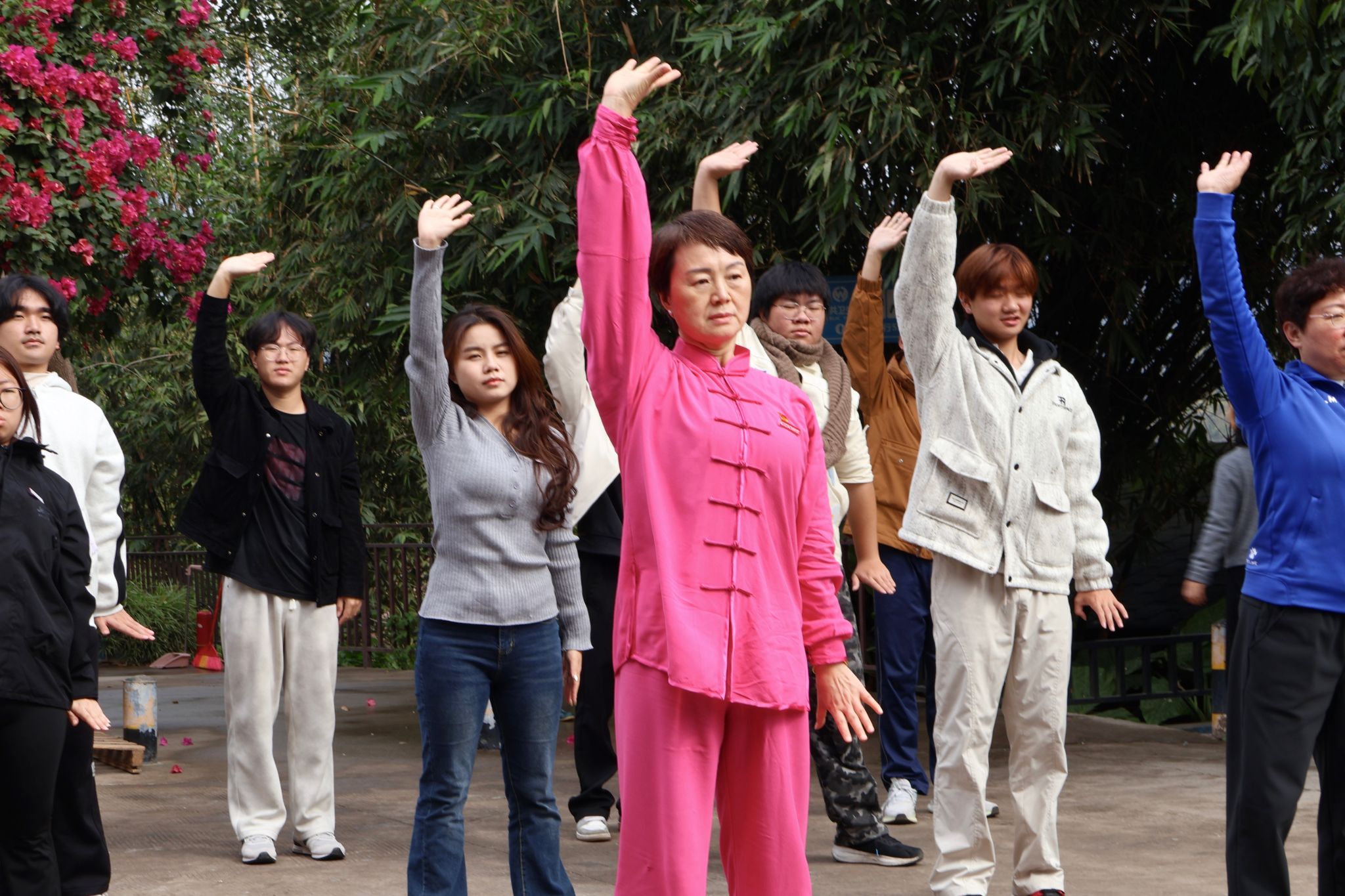 于动静转换间探寻养生之道,这是本次活动的又一文化亮点。蚕丝扇制作体验结束后,师生们在舒缓的乐声中,跟随指导老师凝神静气地练习八段锦。一招一式,不仅让大家在平日忙碌的教学与学习节奏中得以舒缓身心、释放压力,更在集体静心修习中,深刻体悟到中国传统养生文化的深厚底蕴与生命智慧。