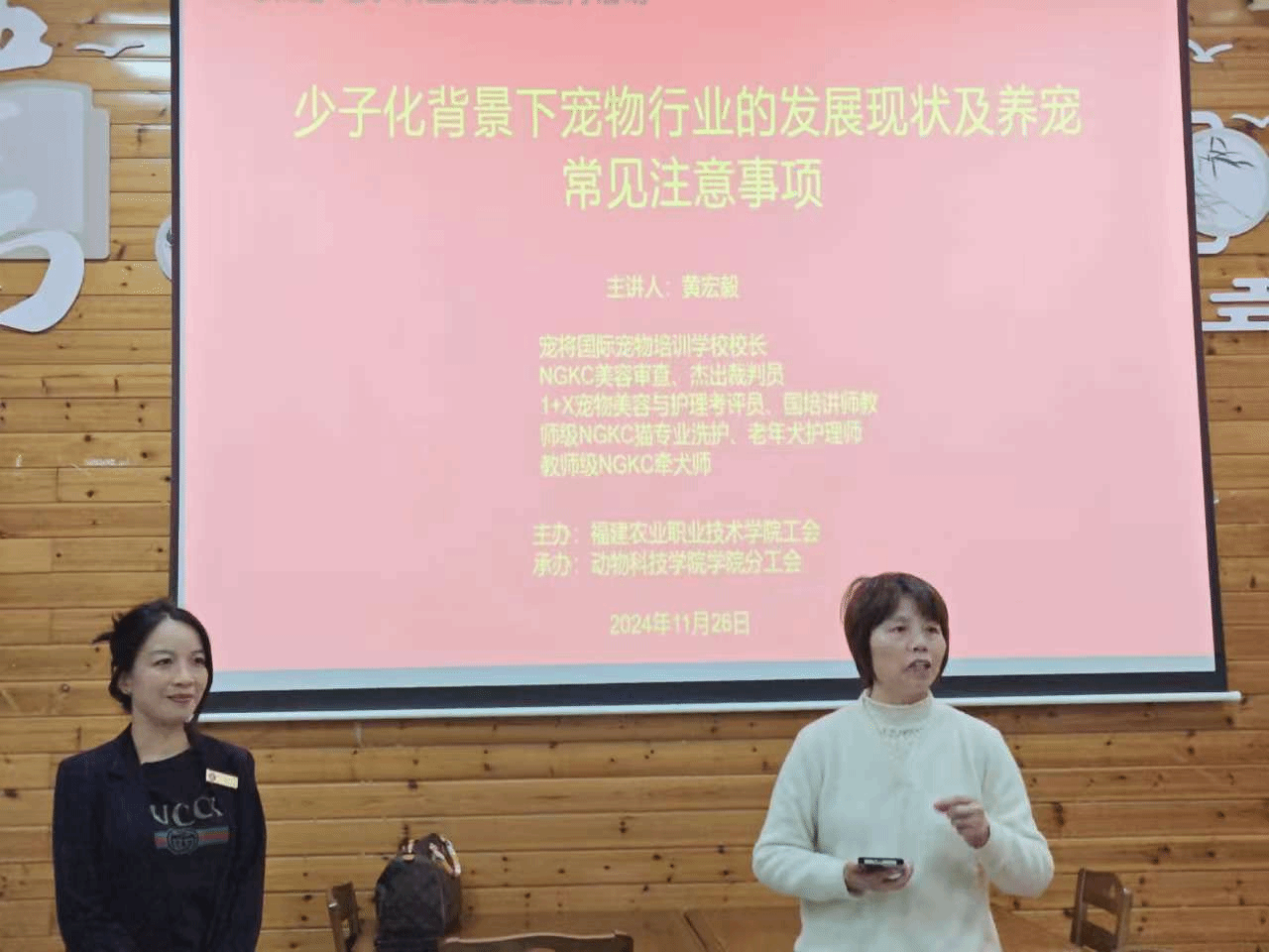 11月26日,由我校工会主办、动物科技学院分工会承办的“人宠和谐”主题月活动在职工之家举行。本次活动邀请宠将国际宠物培训学校校长、NGKC美容审查、1+X宠物美容与护理考评员、1+X宠物美容与护理国培讲师黄宏毅作了以“少子化背景下宠物行业的发展现状及养宠常见注意事项”为主题的专题讲座。