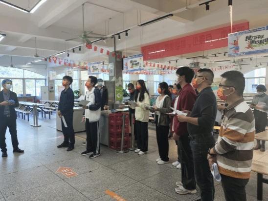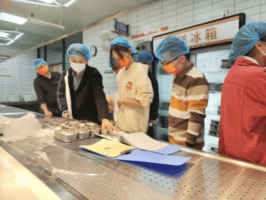 在餐厅经理的带领下,师生一行人先后参观食惠餐厅和禾下餐厅的原材料验收间、食堂洗消间、洁具间、蒸煮间、切配间、烹饪间。伴随着餐厅经理的详细介绍,师生们从认识食堂的“明厨亮灶”智慧服务系统开始,到查看卫生条件、仓储环境、烹饪过程等情况,再到翻阅进货台账、食材“三证”等材料,师生代表“零距离”体验了食品的采购、储存、生产和销售过程。