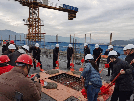 上午9时,领导们挥锹浇筑,共同完成最后一方水泥的浇筑,至此,南区一期重点项目主体结构正式封顶。