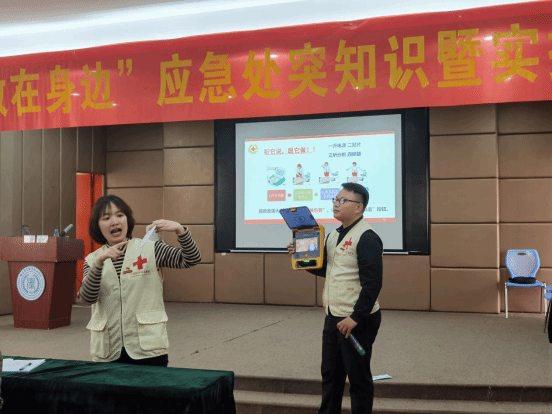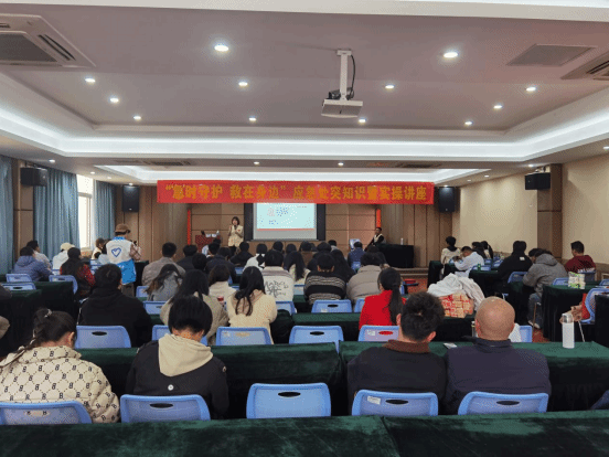 讲座现场,李晶老师通过图文并茂的方式,为大家详细讲解心肺复苏、止血包扎、气道异物梗阻(海姆立克法)、AED除颤仪使用等常见急症的救护方法和操作要点。同时,结合实际案例,重点讲解在第一时间如何采取正确、有效的呼救措施进行急救,如何争分夺秒的进行急救操作等,让师生们深刻认识到掌握应急救护技能的重要性。