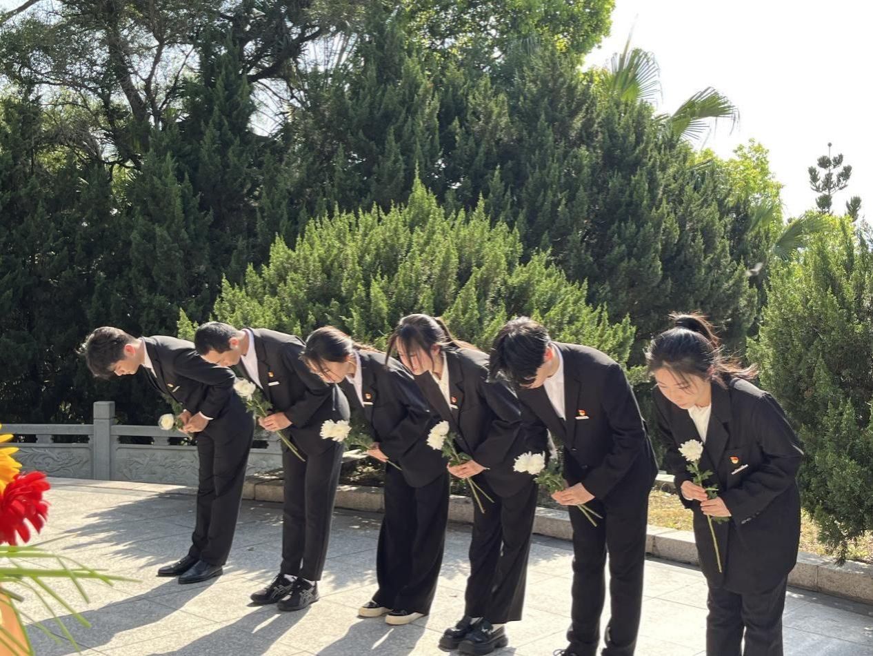 祭扫活动前,信息工程学院王荣晨老师向全体成员讲述林祥谦烈士的生平事迹,共同缅怀他的丰功伟绩,激励党员同志和青年团员要不忘初心、牢记使命、继承遗志、接续奋斗。师生们在烈士纪念碑前整齐站定,神情肃穆,颔首默哀,心怀敬意地鞠躬致敬,一朵朵洁白鲜花被轻轻放在烈士墓前,对烈士致以最崇高的敬意与沉重的哀思,烈士陵园中,国旗护卫队重温军人誓词,他们的声音坚定而深沉,彰显着对祖国的忠诚与热爱。