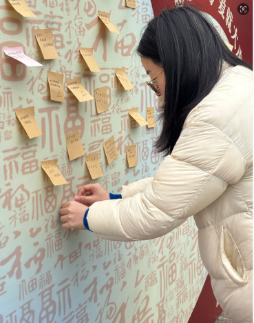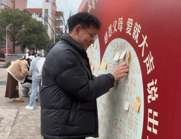 除了制作并传递拗九粥外,学生宿舍11号楼下还开展了“孝心卡”制作及感恩送祝福活动,老师及学生们纷纷在卡片上写下对父母、对长辈的祝福与感恩,并将孝心卡贴在心愿墙上。一张张卡片承载着同学们真挚的情感,表达了对长辈的敬爱与感激之情。