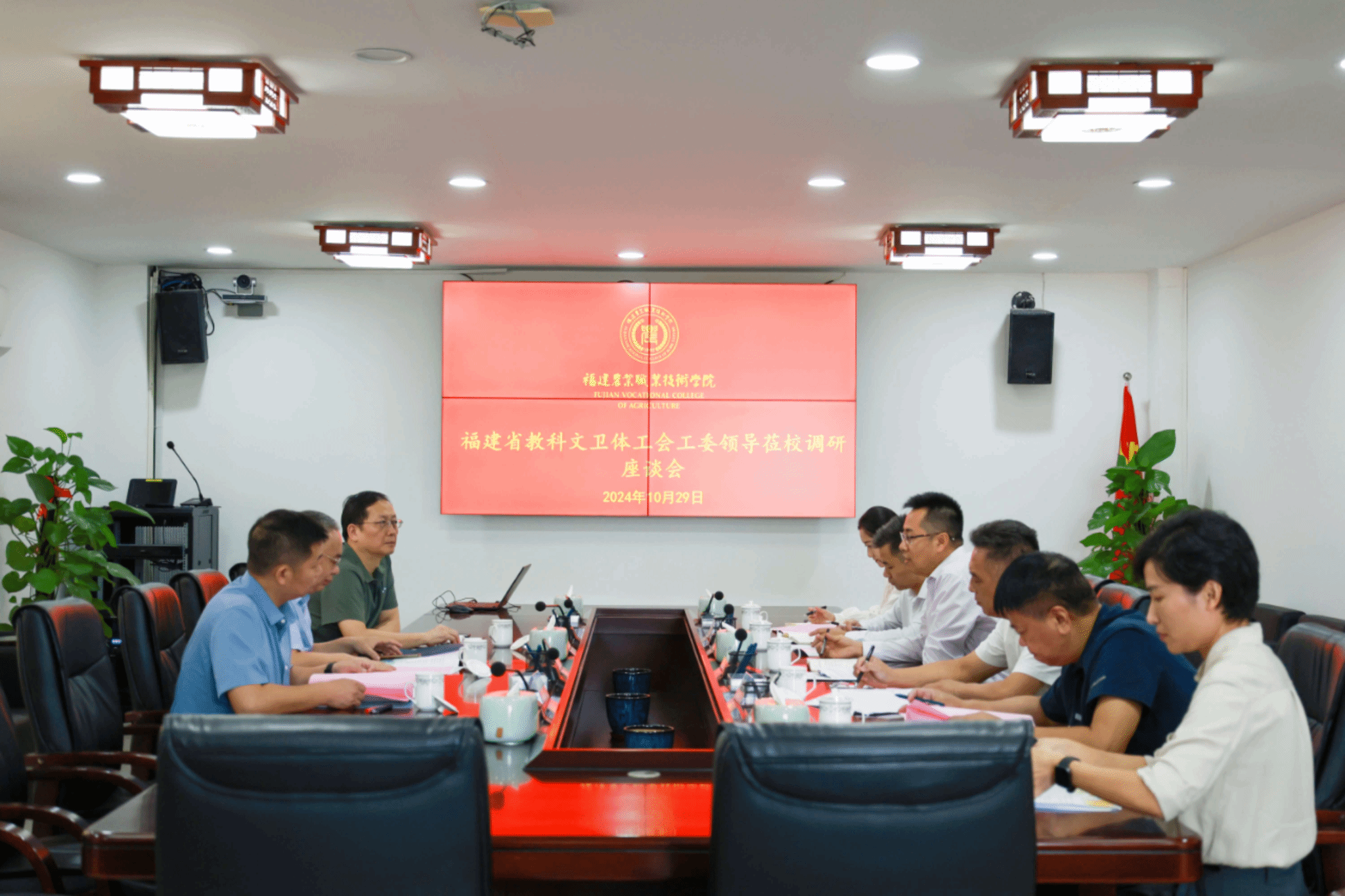 10月29日上午,福建省教科文卫体工会工委主任郭立新、二级调研员翁建清、副主任阳先辉一行3人莅校调研工会工作。学院党委书记杨振坦、副院长兼工会主席严挺文及有关职能部门负责人参加调研座谈会。