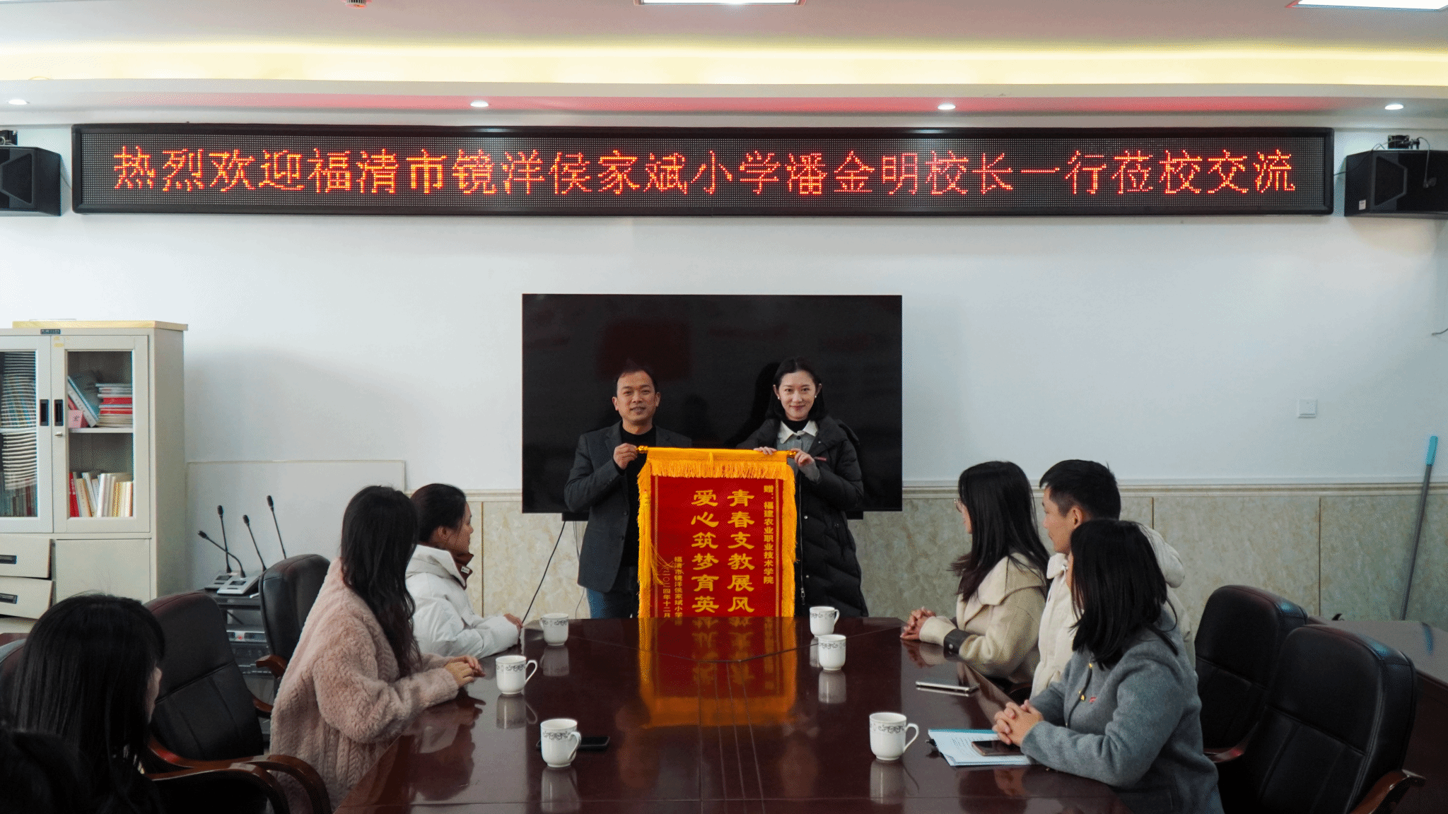 会上,潘金明校长向我校送上印有“青春支教展风采 爱心筑梦育英才”的锦旗,代表福清市镜洋侯家斌小学对学院五年以来对口开展志愿服务活动表达深切谢意,同时为我校辅导员罗雪琴颁授2023-2024学年福清市“优秀少先队员志愿辅导员”荣誉证书。