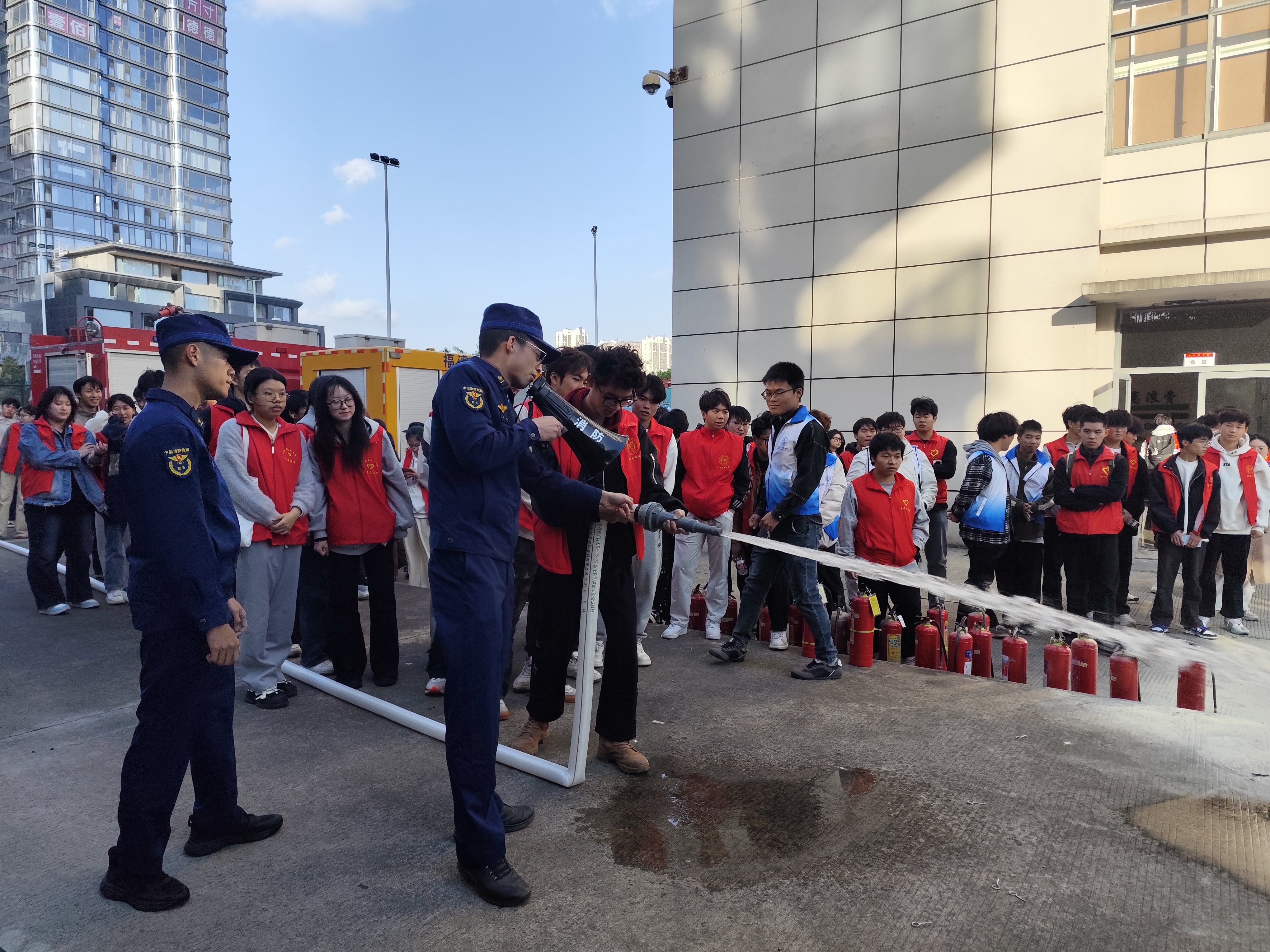 在破拆演练与灭火实操中消防员们展示了从工具检查到成功破拆障碍门,从快速铺设水带到精准出水灭火等一系列标准化、专业化的操作流程,动作娴熟,配合默契,赢得了师生们的阵阵掌声。在消防员的专业指导下,师生们随后在训练场地上进行了实战体验,亲手操作消火栓和灭火器,牢记“提、拔、握、压”的操作要领,掌握了基本的灭火技能。