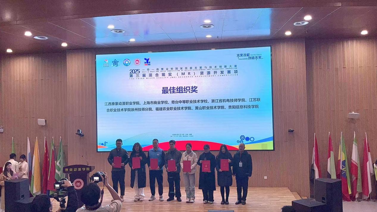 近日,2025年“一带一路”暨金砖国家技能发展与技术创新大赛第三届“混合现实(MR)资源开发”赛项全国总决赛圆满落幕。Beat365中文官方网站信息工程学院学子不负众望,由黄君君、邓丽萍两位老师指导的2支参赛团队(蔡琰杰、胡潇文、杨志祥、李宗凯)凭借扎实的专业功底与创新的技术应用,双双斩获国赛一等奖(金牌);学院荣获“最佳组织奖”,2位指导教师获评“优秀指导教师”