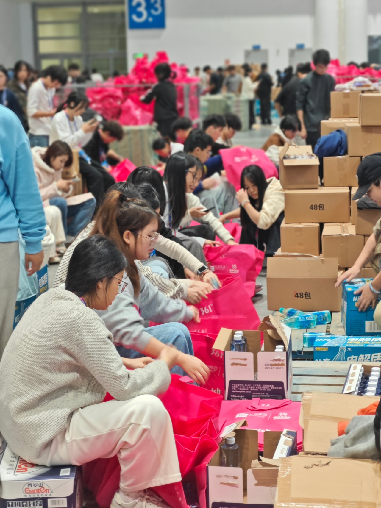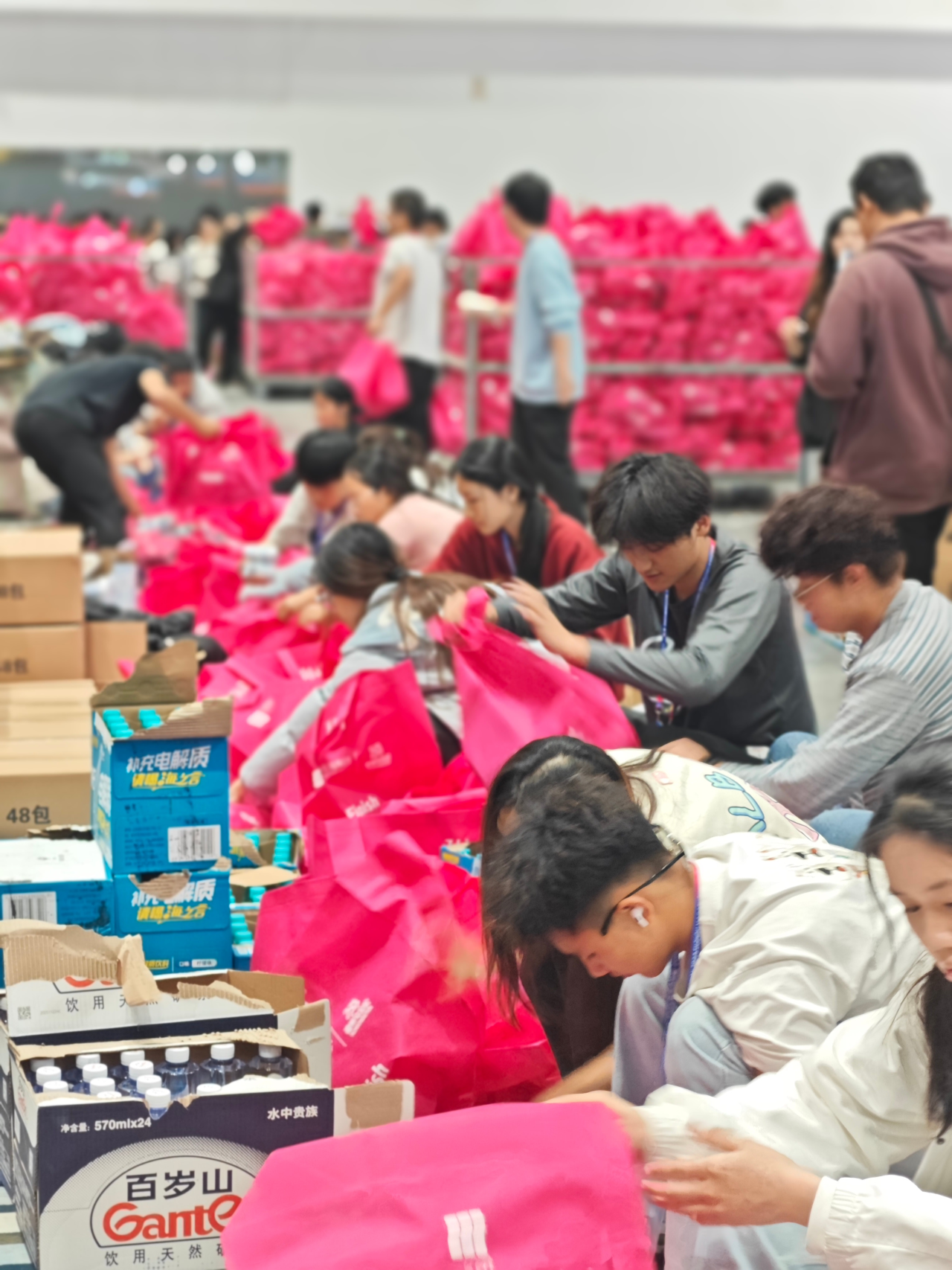 12月13日清晨,志愿者们准时到达各自的岗位。大家分工明确、配合默契,有条不紊地将各类物品装入完赛包中。共计完成35000余份完赛物资的打包工作,每一份完赛包都承载着志愿者们的心血与祝福。
