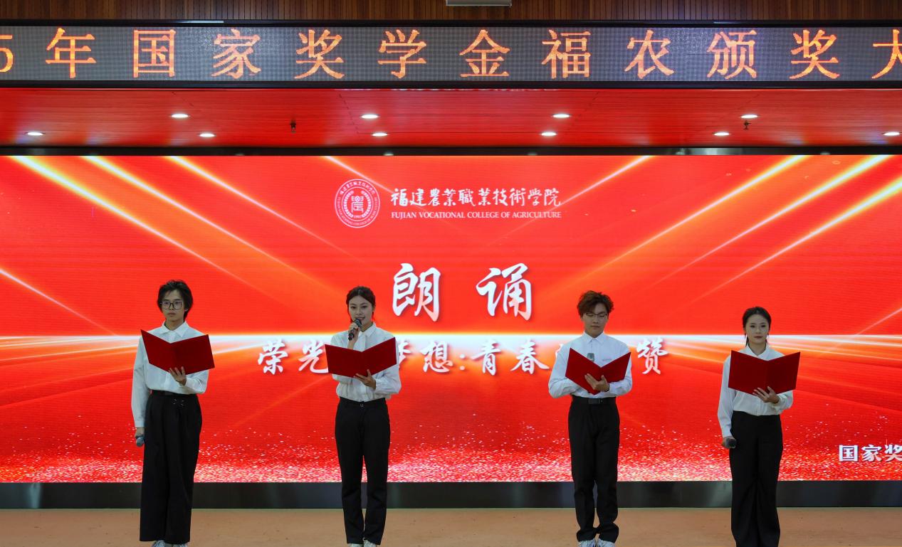 大会在庄严的国歌声中启幕。赵文杰等4名获奖学生代表共同朗诵诗歌《荣光与梦想:青春的礼赞》,以真挚情感抒发对祖国的赤诚与青春的担当,赢得全场阵阵掌声。颁奖环节,获奖学子依次登台,从与会领导手中接过荣誉证书。这些证书的背后,是他们求学途中日夜兼程、勤学苦练的见证,每位获奖者的故事,都是Beat365学子勤勉学习、踏实前行、勇于争先的鲜活体现。