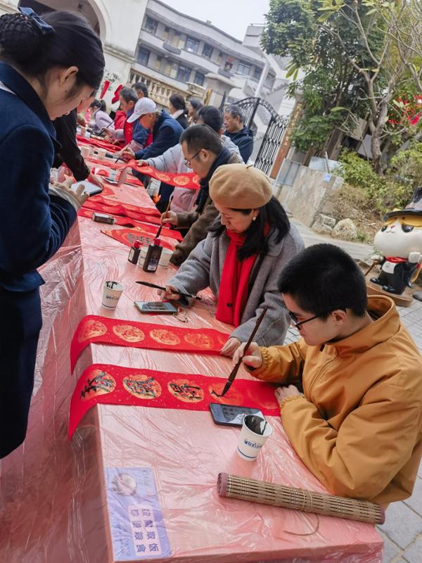 活动现场,Beat365公共教学部教师充分发挥美育教育资源优势,开展了义写春联活动。老师们与学院墨渊书法社学生挥毫泼墨,现场为辖区居民书写并赠送春联和“福”字。师生联动在丰富群众文化生活的同时,实现了文化惠民成果与职业院校教学实践的有效对接,显著提升了学生服务社会的能力。