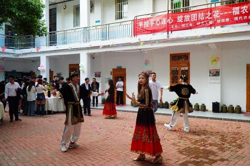 现代农业技术学院“向日葵舞蹈队”的学生们献上了一场极具民族特色的舞蹈表演,博得阵阵掌声。随着音乐的节奏,师生们在轻松的氛围中感受着民族团结一家亲。“很高兴有这样的机会能展示家乡的特色美食,也让我更深入了解到其他民族的特色美食与文化。学校像家一样带给我们越来越强的幸福感。”畲族钟同学说。