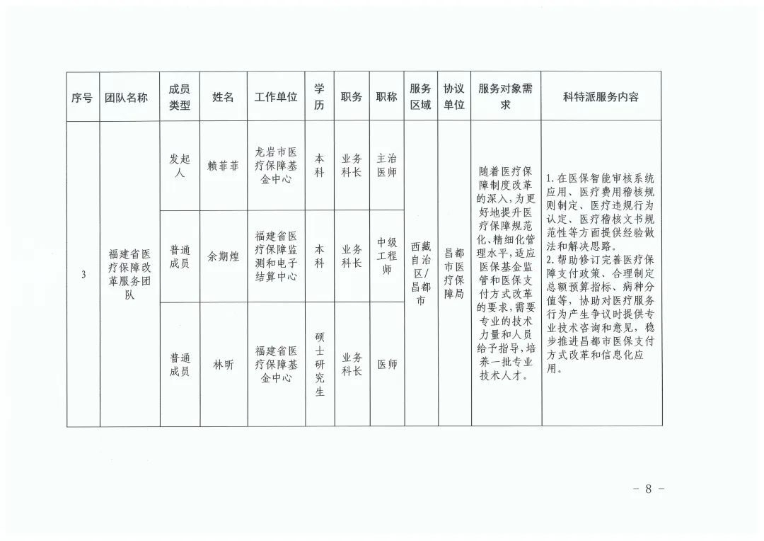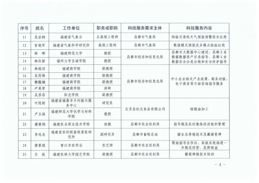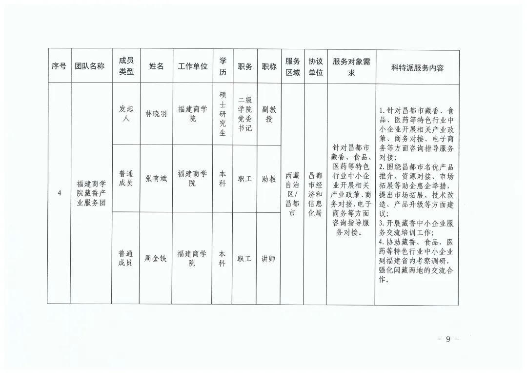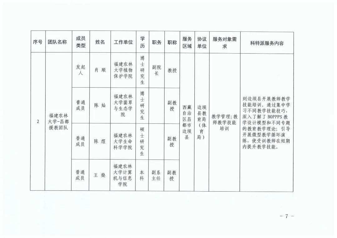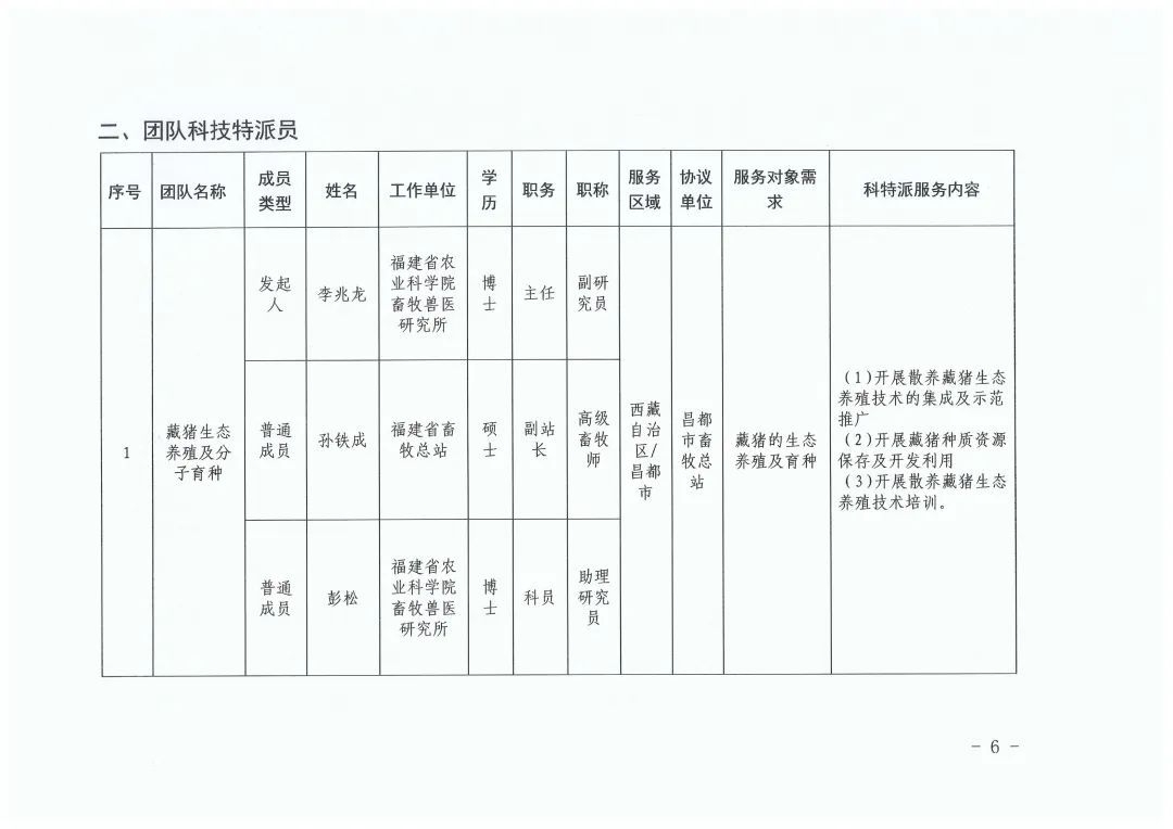 根据《福建省科学技术厅关于开展2024年福建省科技特派员(闽藏协作)选认工作的通知》(闽科农函〔2024〕68号),经个人申报、西藏昌都市需求单位筛选、福建省第十批援藏工作队与昌都市科技局分别审核确认、省科技厅研究,决定选认2024年度福建省科技特派员(闽藏协作)个人科技特派员37名、团队科技特派员6组(名单详见附件,同时公布在福建省科技特派员服务云平台门户网站,网址:http://www.fjktp.cn)。