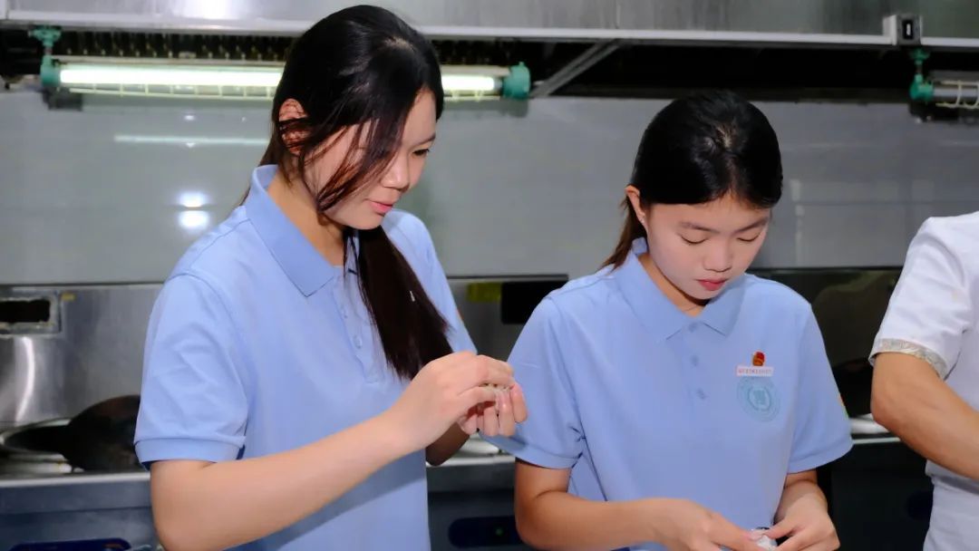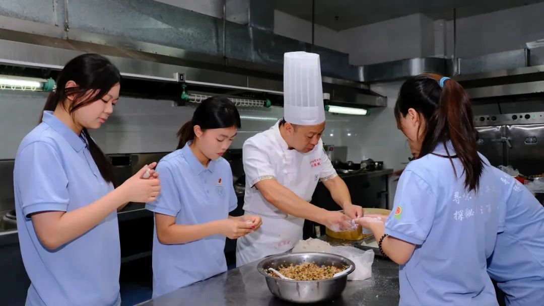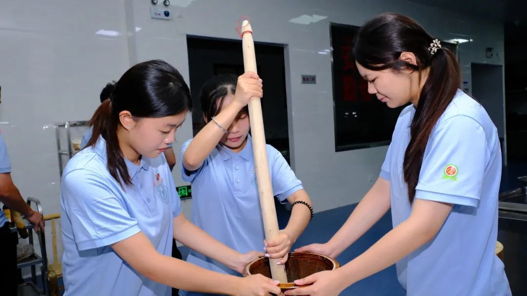 实践队首站深入客家小吃文化。在作坊里,队员们跟着师傅学做烧卖、擂茶,从捏制均匀褶子到研磨细腻茶汤,亲手触碰客家美食的千年传承。