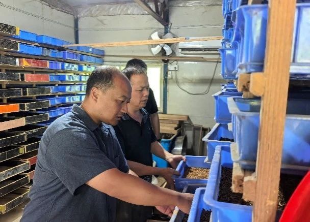 ▲走访新桥乡坑坪村棘胸蛙养殖基地
