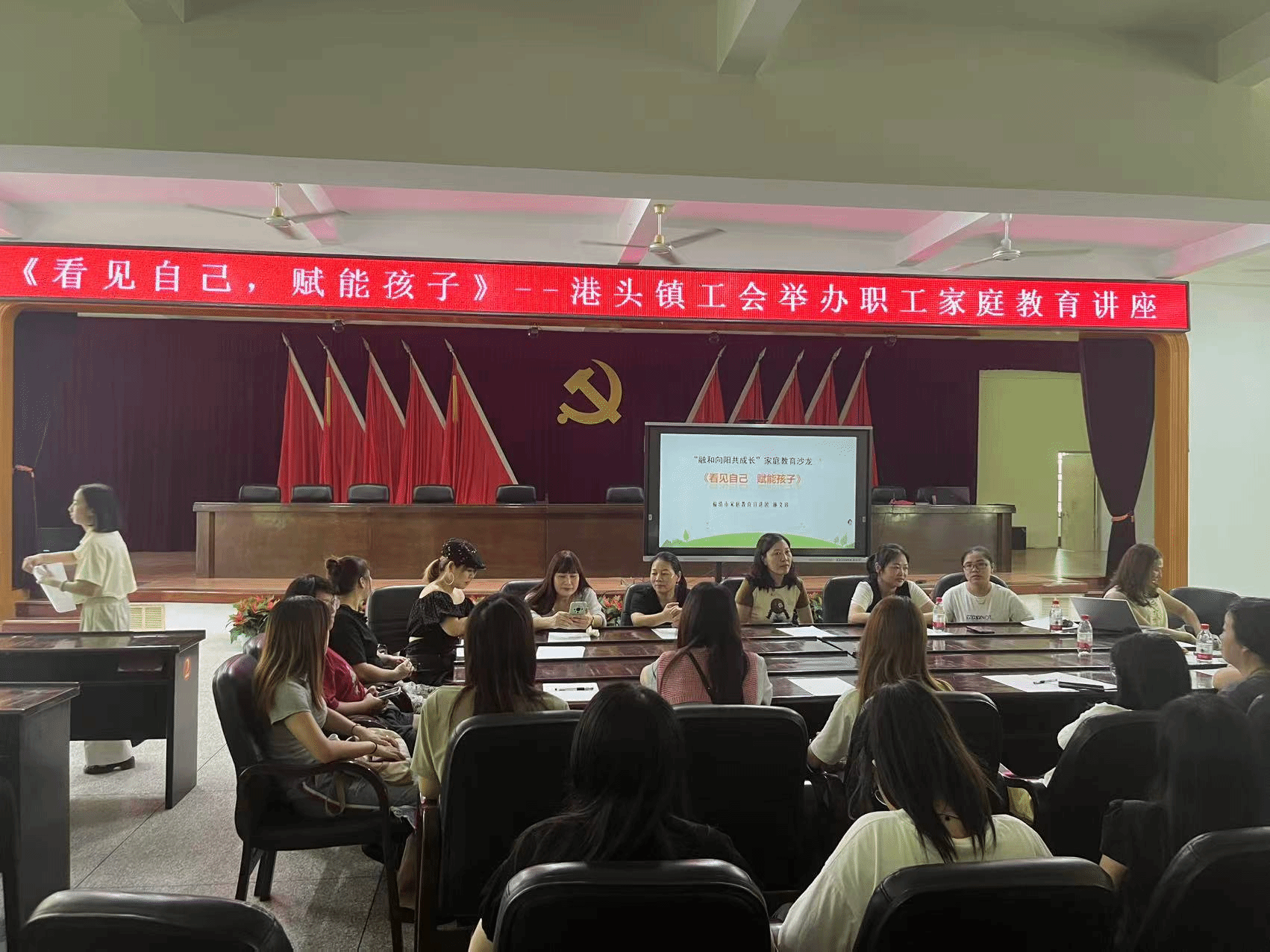 为进一步提升广大职工群众科学育儿能力,增进职工家庭幸福与社会和谐,港头镇工会联合镇妇联组织开展了以《看见自己,赋能孩子》为主题的职工家庭教育讲座。此次讲座邀请到福清市家庭教育讲师团的林老师来为大家进行授课。