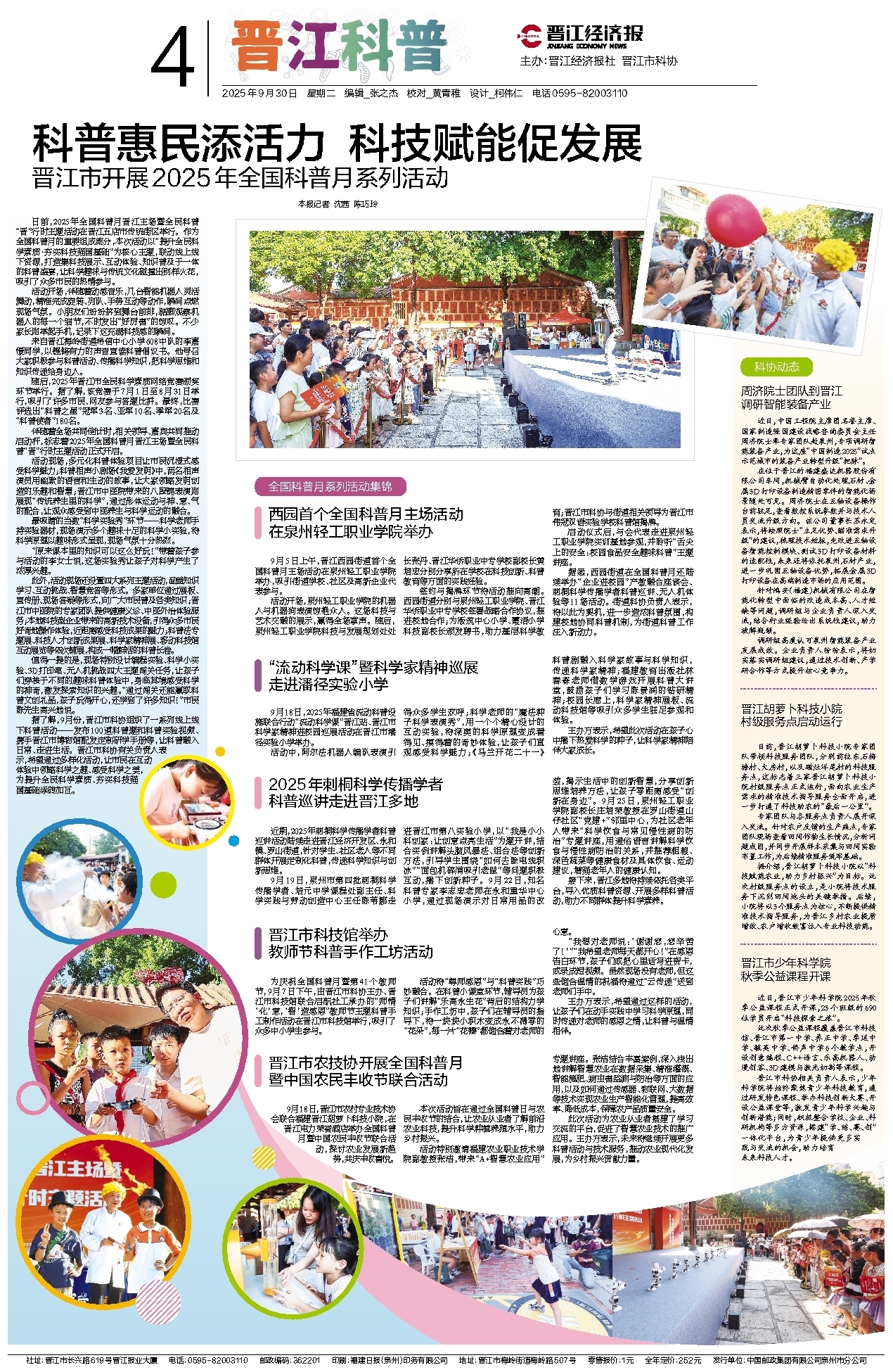 据了解,9月份,晋江市科协组织了一系列线上线下科普活动——发布100道科普题和科普实验视频、携手晋江市博物馆配发定制研学手册等,让科普融入日常、走进生活。晋江市科协有关负责人表示,希望通过多样化活动,让市民在互动体验中领略科学之趣、感受科学之美,为提升全民科学素质、夯实科技强国基础添砖加瓦。