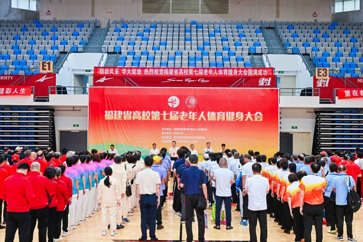 10月20日下午,福建省高校第七届老年人体育健身大会闭幕式在华侨大学林淑真体育馆举行。福建省高校老年人体育协会主席刘剑津、秘书长骆积强,华侨大学副校长缑锦,以及来自全省各高校的领队、教练员、运动员、裁判员和工作人员参加闭幕式。