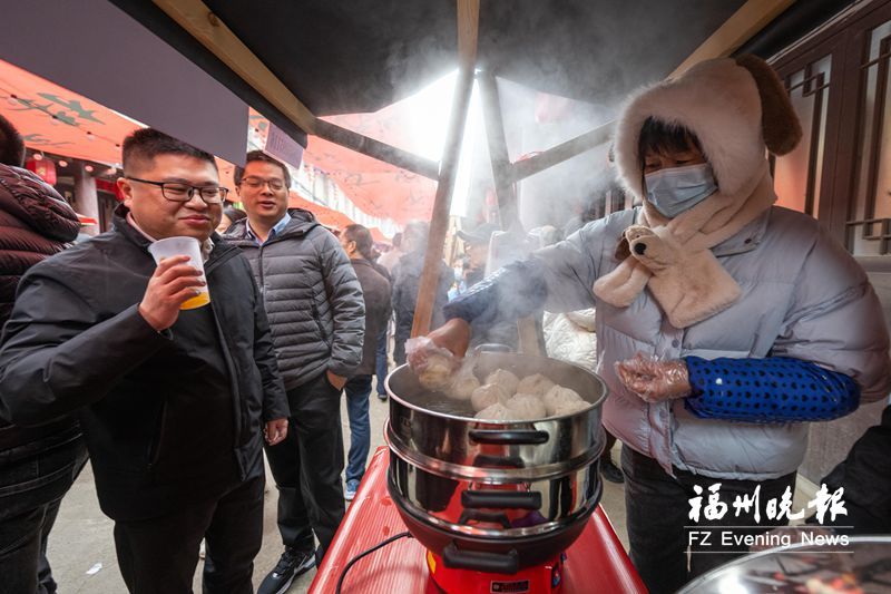 八闽美食嘉年华区域,在20个侯官特色美食摊位上,陆续摆上炒糕、年糕、萝卜糕、鱼丸、锅边、炖罐、花生汤等地道侯官味;在闽侯14个乡镇“一镇一品”美食摊位上,呈上乡亲们精心挑选出的青红酒、橄榄、脐橙、礼饼、甘蔗、绣球菌等乡村好物……叫卖声此起彼伏,摊位前门庭若市。