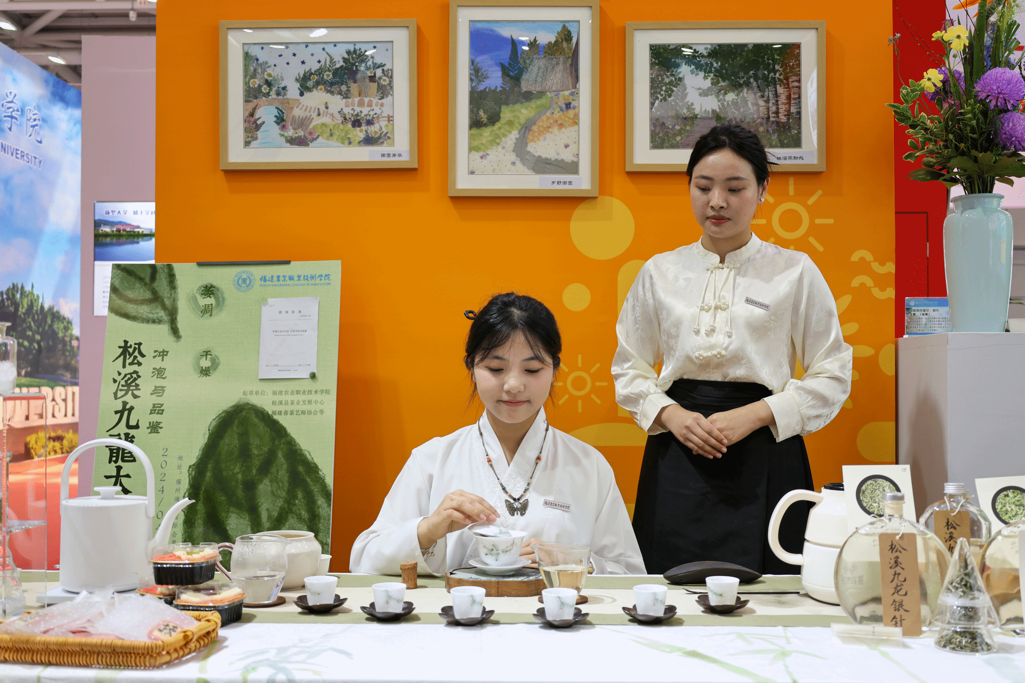 “您可以试下我们的松溪九龙银针和九龙白牡丹。”展区中,身穿新中式茶服的茶艺专业学生正在给到访的来宾推荐来自福建松溪的九龙大白茶。精致的茶器、醇厚的茶汤,素不相识的八方来宾共享一方茶席,飘逸灵动的茶艺与蕴含匠心匠韵的押花作品柔婉写意、交相辉映,于茶香氤氲中绘就学院校园文化的底色。