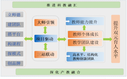 同时遵循“立师德、建团队、搭平台、构课程、探模式、创品牌”建设思路,通过“大师引领、项目驱动、三站联动”,结合“双师型”教师个体成长和“双师型”教学团队建设,促进教师能力提升、促进高水平、结构化教师创新团队,提升“双元”育人水平。