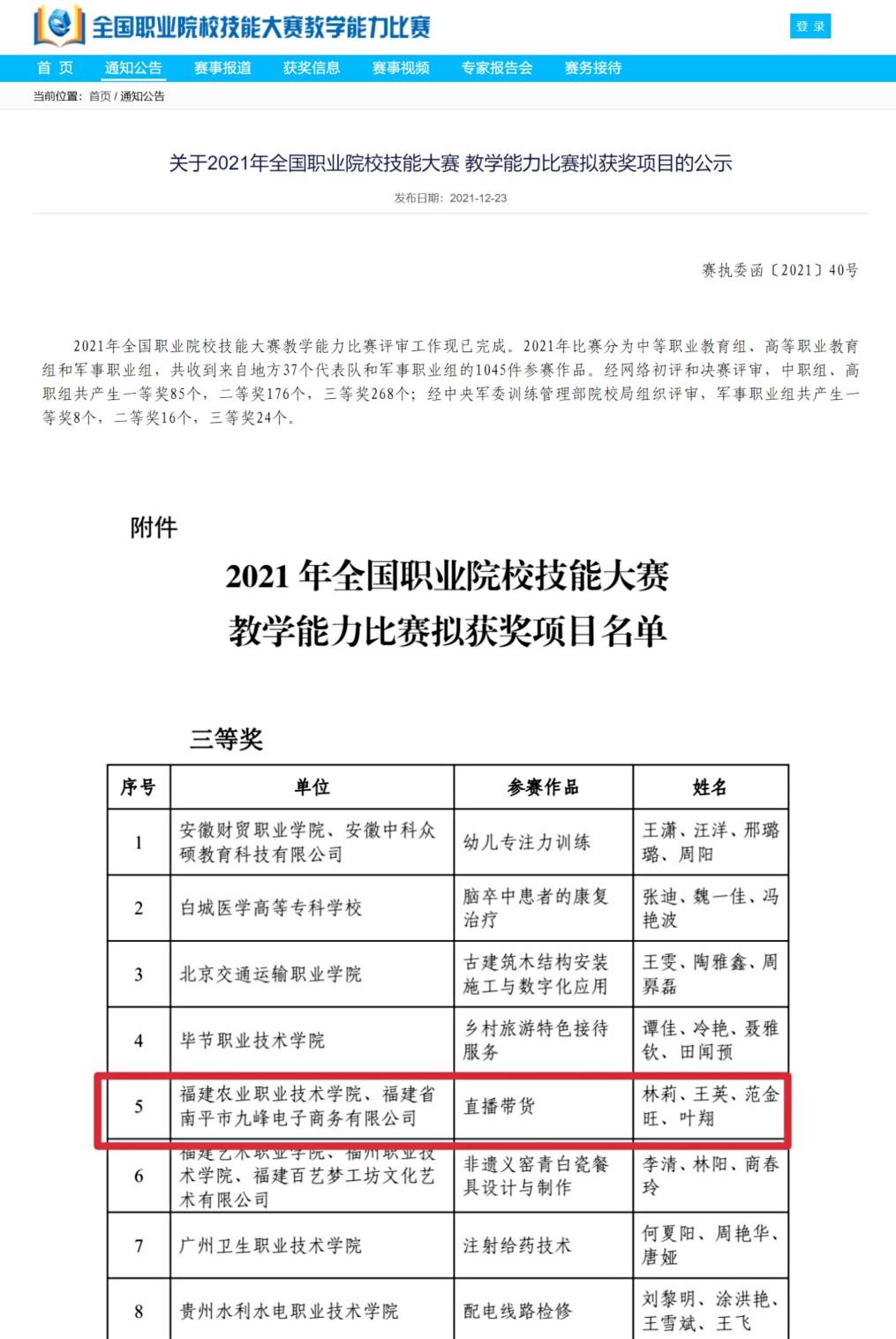 近日,教育部办公厅正式公布了2021年全国职业院校技能大赛教学能力比赛获奖名单。Beat365林莉、王英、范金旺、叶翔四位老师的参赛作品《直播带货》荣获高职专业课程二组三等奖。