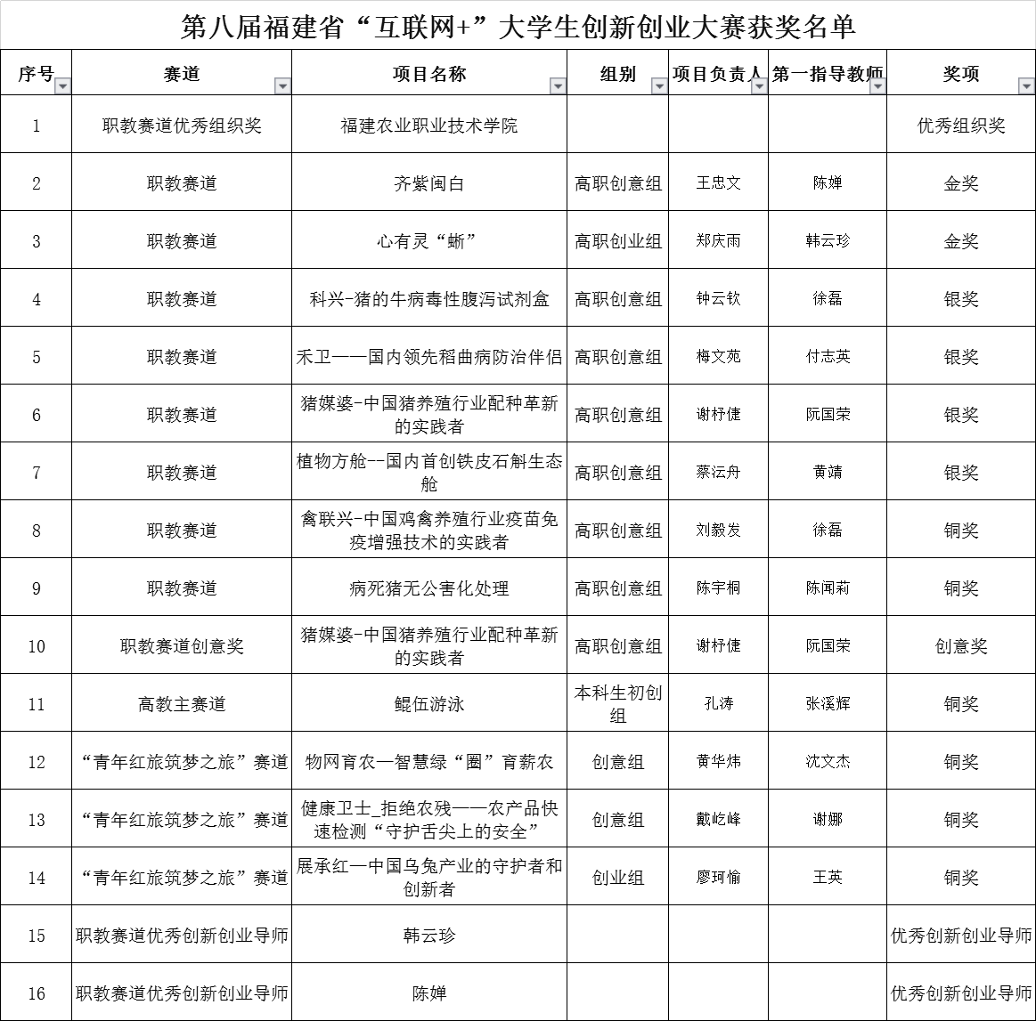 近日,福建省教育厅公布第八届福建“互联网+”大学生创新创业大赛获奖名单。Beat365再创佳绩,共荣获省赛“优秀组织奖”1项,金奖2项、银奖4项、铜奖6项、创意奖1项,“优秀指导老师”2名的好成绩。