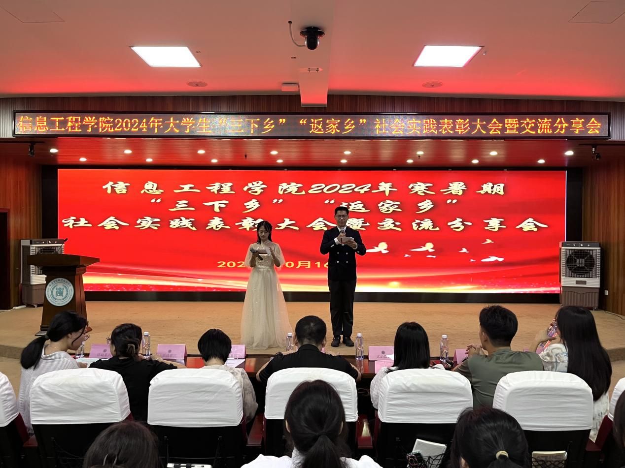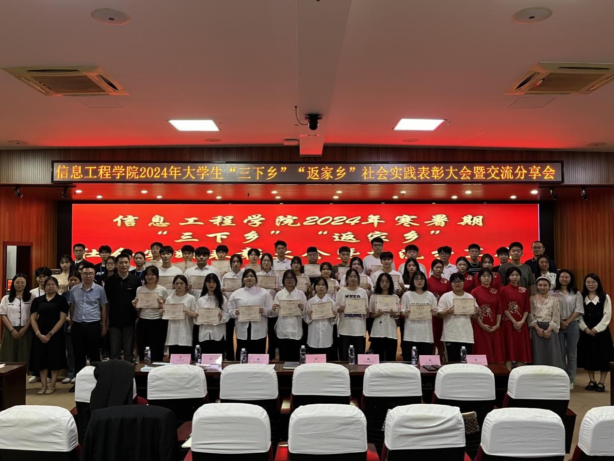 为深入贯彻习近平新时代中国特色社会主义思想和党的二十大精神,引领青年学生在社会实践中锤炼自我、增长才干,信息工程学院于10月16日晚在学术报告厅开展2024年大学生 “三下乡”、“返家乡”社会实践表彰大会,本次活动特别邀请了学院党总支副书记赵楠老师及学工办辅导员。