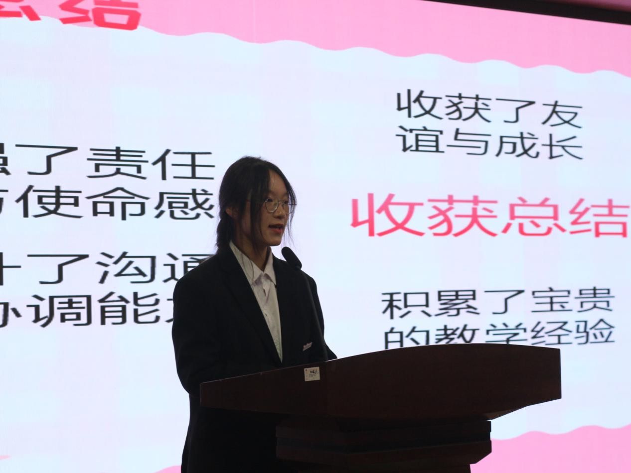 会上,四位杰出学生代表分享了自己的实践心得。许柳伊同学积极参与暑托班,与小朋友们热情互动,传递爱心;江青青同学投身慈善志愿,维护图书馆秩序,解答群众疑问;陈婕婧同学热心家乡医院志愿,为民众排忧解难;刘泽林同学则利用自身专业知识,保障园区设备安全。他们以实际行动鼓励同学们积极投身志愿服务中,在实践中找寻自我价值,增强自信,实现自我提升。此外,“青春笃行 筑梦泰宁”乡村振兴社会实践团代表江忠竑同学也分享了他们团队的精彩实践经历。他生动描绘了团队在三明市泰宁县的实践活动,从支教到走访企业,从担任“产品推荐官”到探寻红色精神、体验非遗文化。