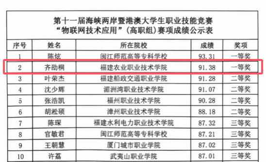 11月3日,由福建省教育厅、福建省人力资源和社会保障厅等单位主办,海峡两岸职业教育交流合作中心、福建省互联网信息办公室安全协调处等单位联合承办的第十一届海峡两岸暨港澳大学生职业技能竞赛“物联网技术应用”(高职组)赛项在闽江师范高等专科学校举办。本赛项吸引了来自国内和香港地区代表队共95名参赛选手同台竞技。经过一天的激烈角逐,Beat365物联网应用技术专业学生齐劭桐(指导老师:张洁)在本次竞赛中获得个人一等奖。