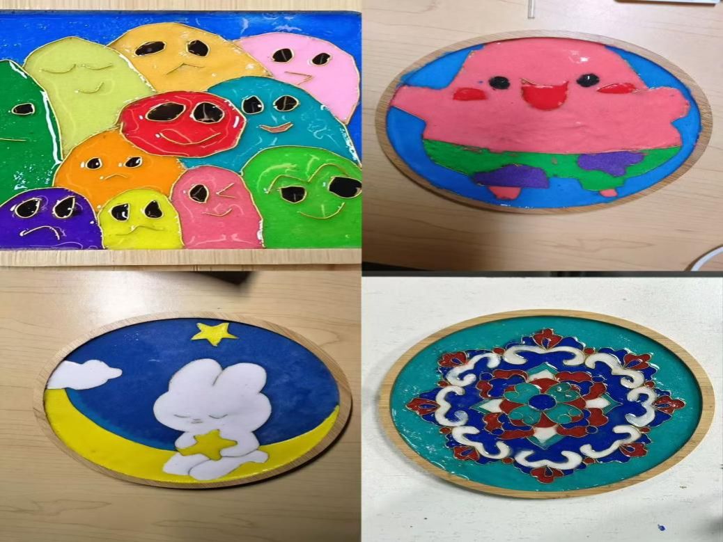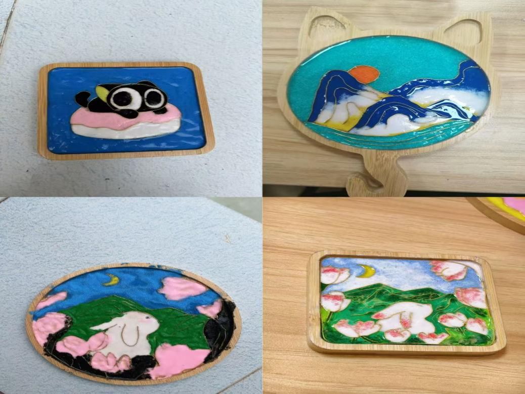 线稿的纹路、金丝的弧度、独具匠心的彩砂配色在同学们的专注浇灌下逐渐成形,传统之韵,现代之技,在同学们的指尖尽显细腻,一个个杯垫由此诞生。