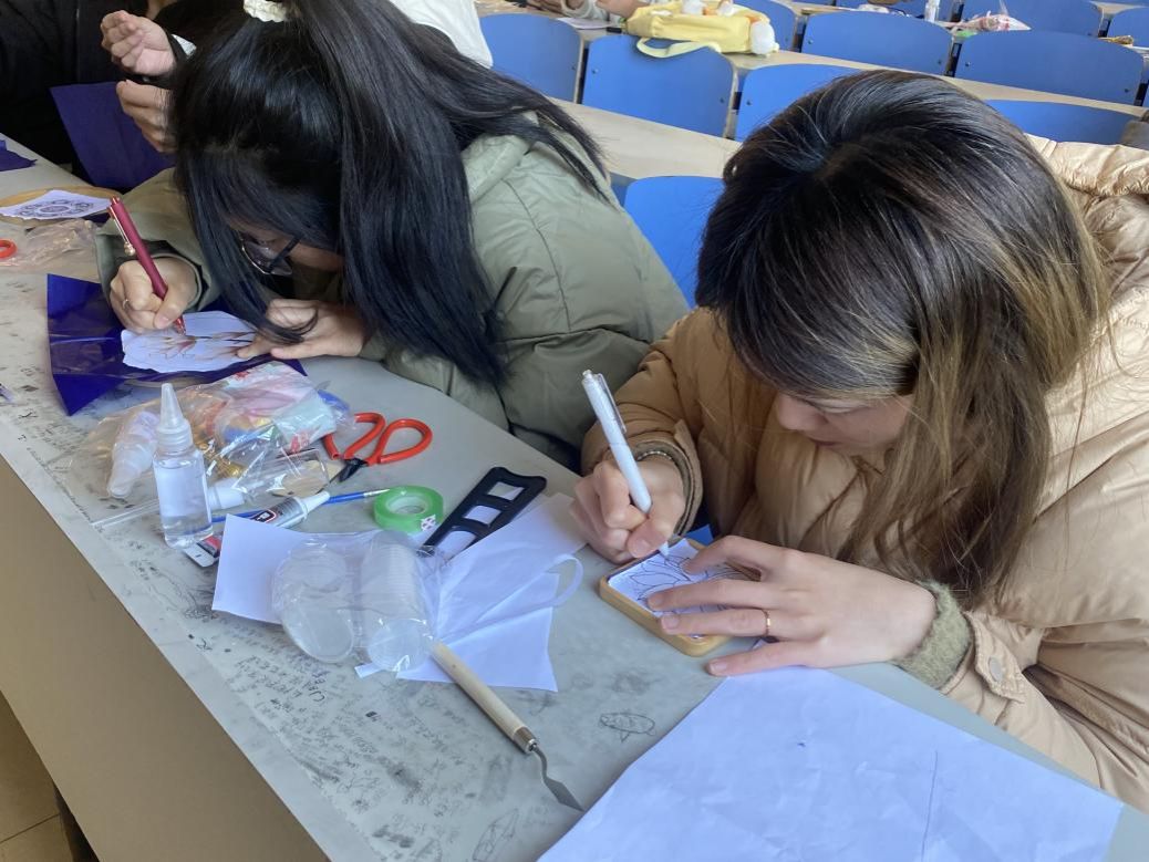 活动现场,工作人员首先为大家讲解了掐丝珐琅的历史渊源和制作工艺,其精湛的技艺与深厚的文化底蕴令在场的同学们啧啧称奇。随后,在工作人员的悉心指导下,同学们纷纷动手尝试。大家精心挑选自己喜爱的图案,用镊子将纤细的铜丝掐出形状,小心翼翼地黏贴在杯垫上,形成流畅的线条轮廓,色彩斑斓的珐琅釉料在大家的巧手下均匀地填入图案中,宛如绘制一幅微型的艺术画卷。
