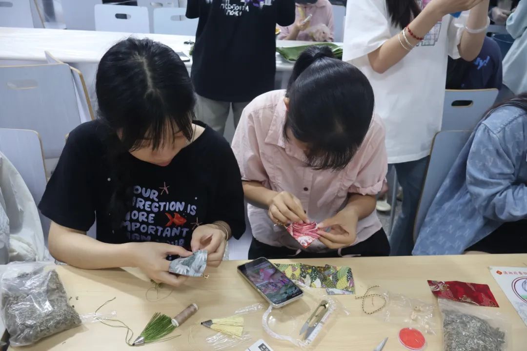 活动现场,参与者们纷纷领取香囊材料包,在工作人员的引导下,开始制作艾草香囊。大家专注地将艾草与香料小心翼翼地装入彩色棉布中,用针线细致缝合,再配上精美的装饰配件。每一个步骤都饱含着对传统文化的敬意与热爱。