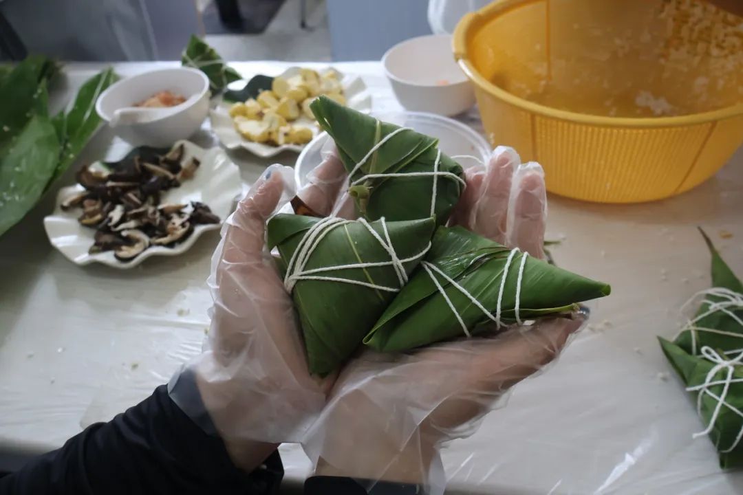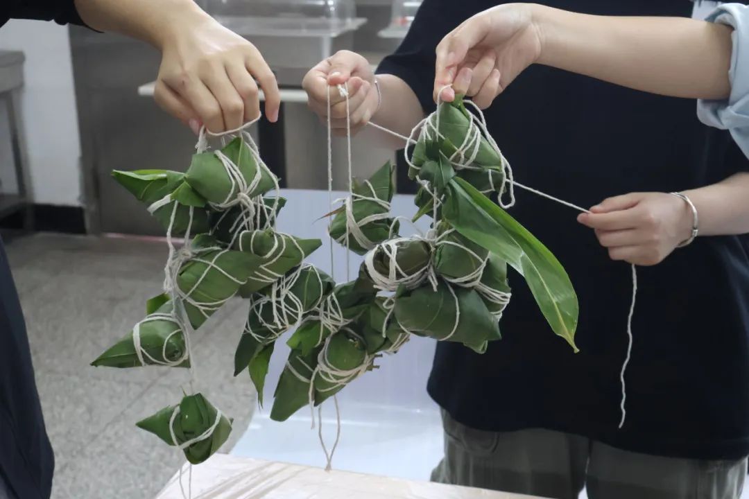 活动伊始,工作人员悉心讲解、耐心指导。同学们兴致勃勃地开始包粽子,先铺上翠绿粽叶,再填入糯米,放入粽馅,最后扎紧线绳。起初,大家手法生疏,包出的粽子形态各异。有的松散得好似要“散架”,有的紧实得宛如小石块。但同学们相互帮助、彼此交流,渐渐掌握了诀窍。