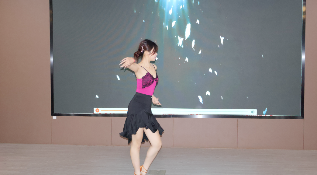 暖场节目——网销2501班周媛琪同学带来拉丁舞表演《雀跃》热情奔放的舞姿及现场的游戏互动环节,瞬间点燃现场氛围。