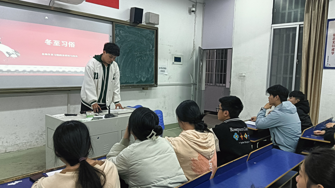 活动现场通过PPT讲解、趣味问答等形式,带领同学们探寻冬至“亚岁”的历史渊源,解锁南北饮食习俗差异。从“冬至大如年”的古老传统到“吃饺子不冻耳朵”的民间趣谈,同学们在轻松交流中感受中华传统文化的魅力。