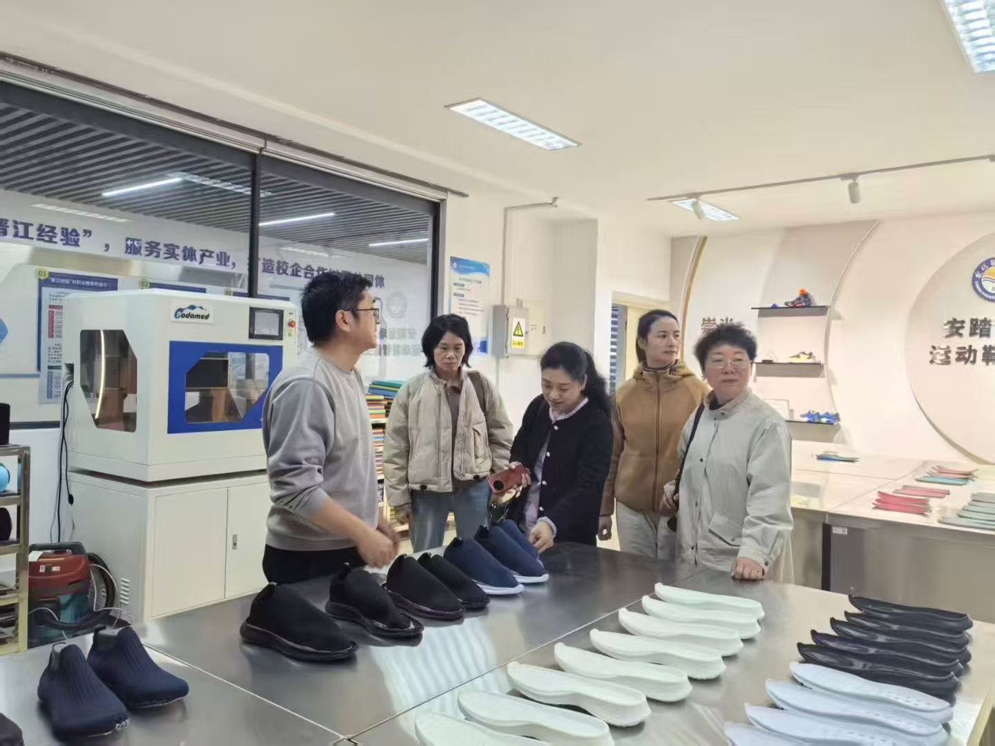 上午,考察组首先抵达黎明职业大学,聚焦该校数字媒体技术及鞋服专业的办学特色、人才培养模式及产教融合成果开展深入调研。在各学院负责人的全程引导下,考察组先后走访融媒体实训中心、数字文创工作室、制鞋智能生产中心等场地,详细了解相关专业的教学安排与实训开展情况,特别是鞋服智能制作等实训环节,并深入了解企业工作过程导向教学的具体实施模式。
