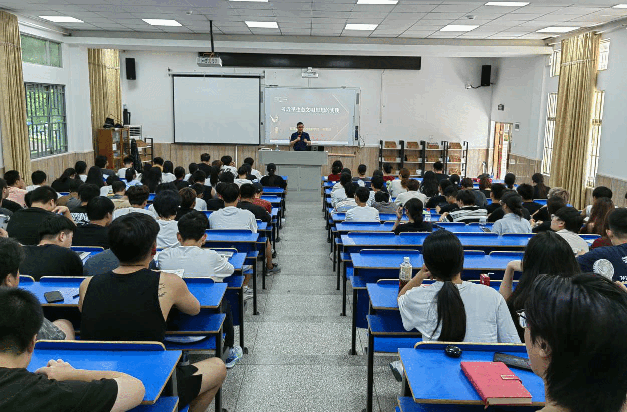 何东进院长以党的二十大报告中关于“人与自然和谐共生的现代化”导入,围绕生态文明的概念与产生的背景、如何加强生态文明建设等问题,结合习近平在福建推动筼筜湖治理、木兰溪治理、长汀水土流失治理等生动实践故事,强调生态文明建设的重要性;以浙江安吉余村的变迁讲述“两山”理论的内涵,强调生态文明建设的着力点。何院长认为,党的二十大对农业强国建设作出重要部署,并强调要“扎实推进乡村生态振兴”,作为涉农高校的新时代大学生要牢记习近平总书记的嘱托,志存高远、脚踏实地,把课堂学习和乡村实践紧密结合起来,毕业后在乡村振兴的大舞台上建功立业,为加快推进农业农村现代化、全面建设社会主义现代化国家贡献青春力量。