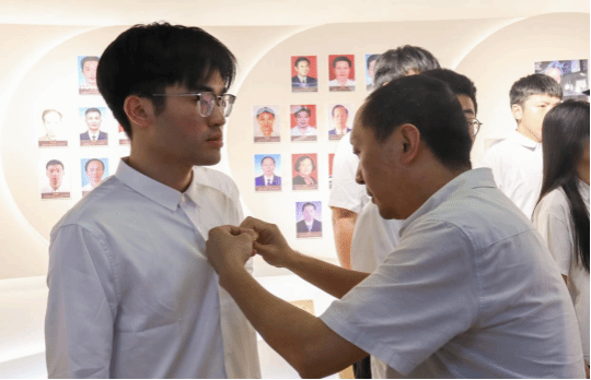(为新团员佩戴团徽)